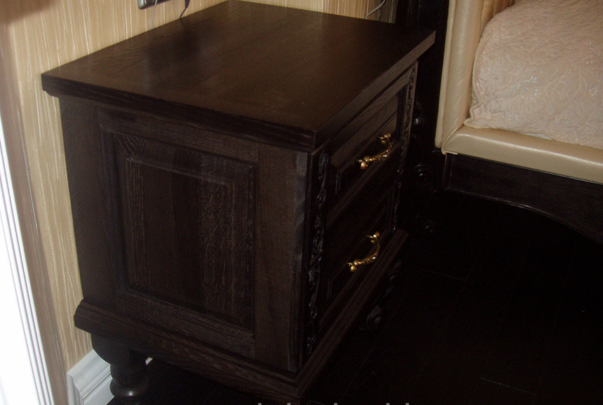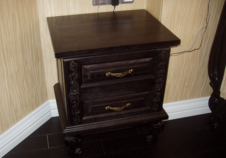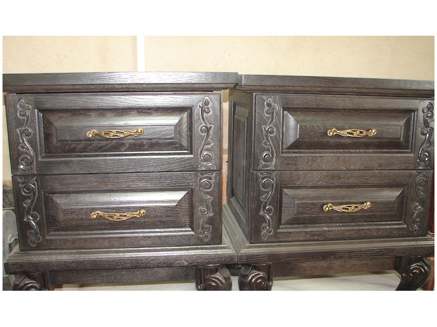 Прикроватный комод, укомплектованный двумя выдвижными ящиками, украшен элементами ручной резьбы. Данную модель можно приобрести в комплекте с удобной кроватью, выполненной в одном стиле с комодом.
