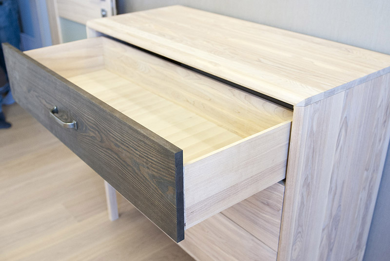 Комод с современным дизайном изготовлен из натурального массива. Поверхность изделия покрывает специальное масло. Фурнитура Blum Movento отличается высоким качеством и отличной функциональностью. Каждый из трех выдвижных ящиков оснащен удобной ручкой.