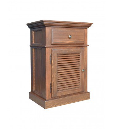 Компактная тумба для классического интерьера в строгой расцветке под орех. Крышка с резным карнизом и торцы с филенками. Дверца с неподвижными жалюзи. Выдвижной ящик и дверца с маленькими круглыми ручками-кнопками.