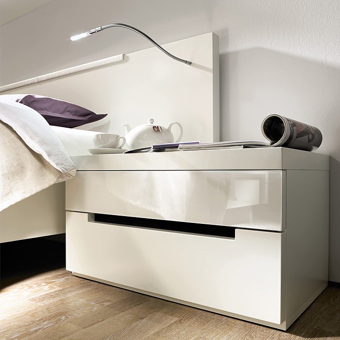 Прикроватная тумба из качественной ДСП Egger станет удобным дополнением для любой спальной комнаты. Габариты тумбы позволяют использовать ее как небольшой прикроватный столик. Тумбочка для спальни оснащена двумя выдвижными ящиками, которые выдвигаются при помощи фрезерованной ручки. Фасад выполнен из пленочного МДф и выкрашен в белый глянец.
