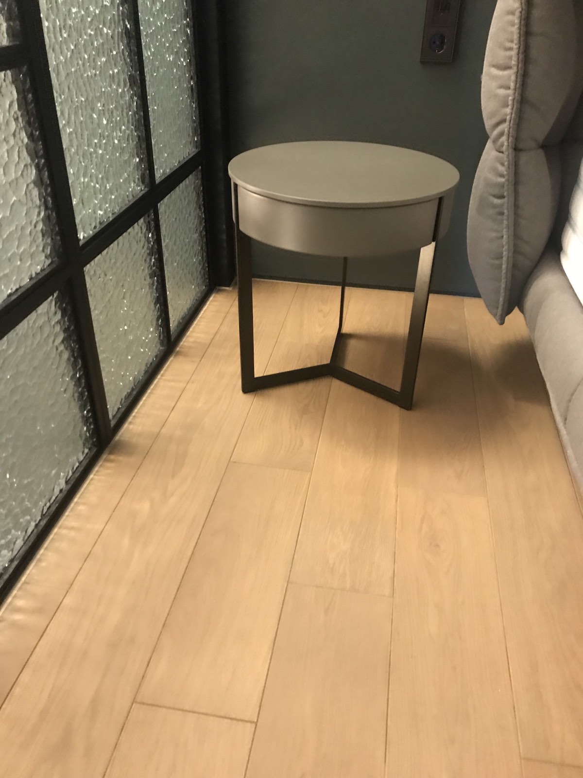 Прикроватный круглый столик в стиле минимализма серого цвета для размещения в спальне. Отличительная особенность модели, выгодно выделяющая ее из ряда других - необычная форма ножек.