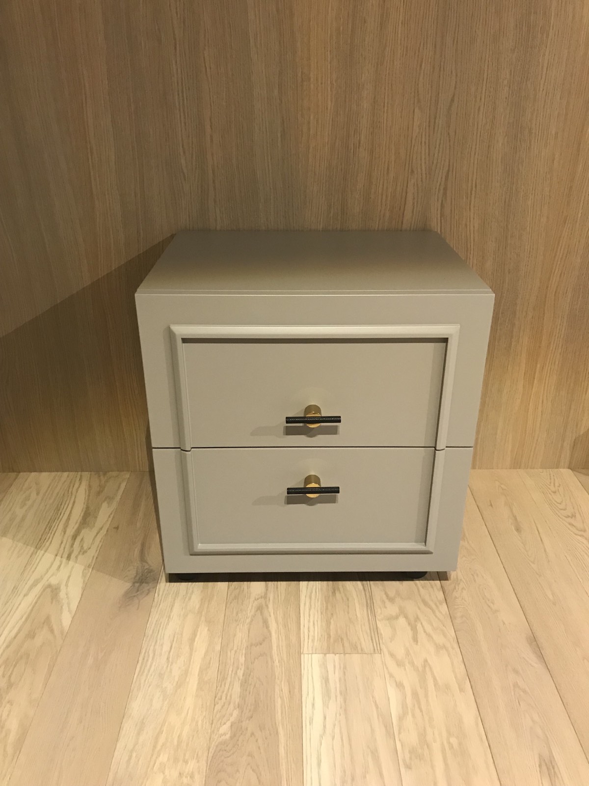 Прикроватная тумба с двумя отделениями для хранения, компактных размеров. Нейтральный бежевый цвет будет гармонично сочетаться практически с любым интерьером. Удобные двухцветные ручки на дверцах полок.