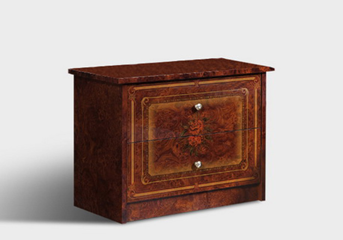 Прикроватная тумба с нанесенным декоративным рисунком отлично впишется в классический интерьер, при этом, остается современной по своему функционалу. Два выдвижных ящика позволят хранить вещи с удобством и комфортом, а безупречный внешний вид порадует глаз и оставит самые лучшие впечатления.