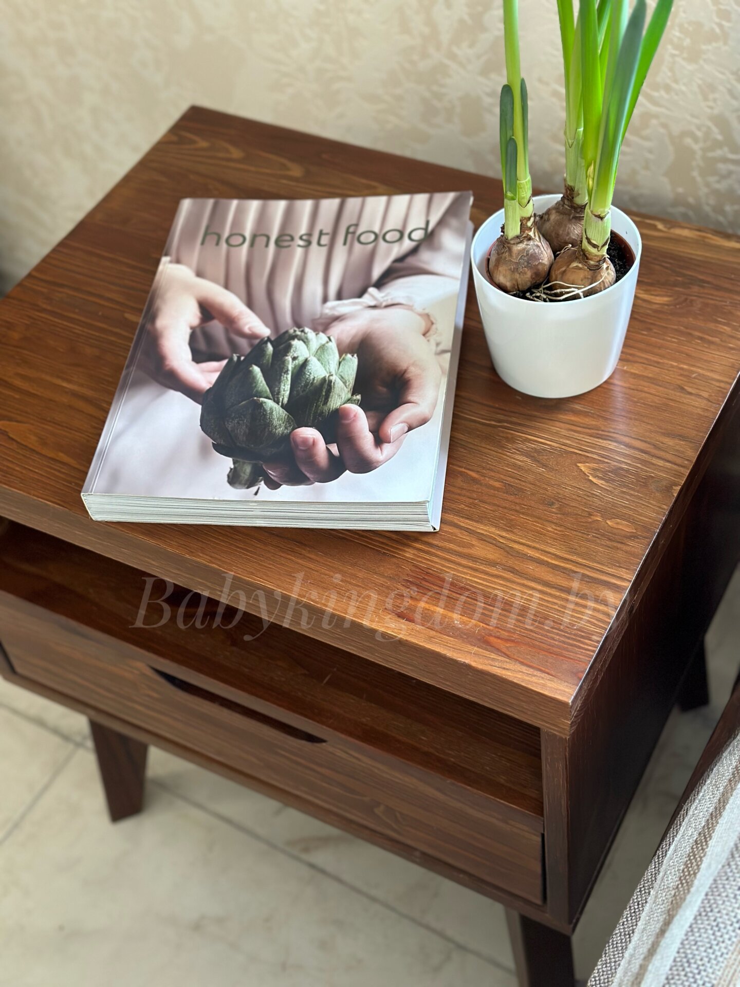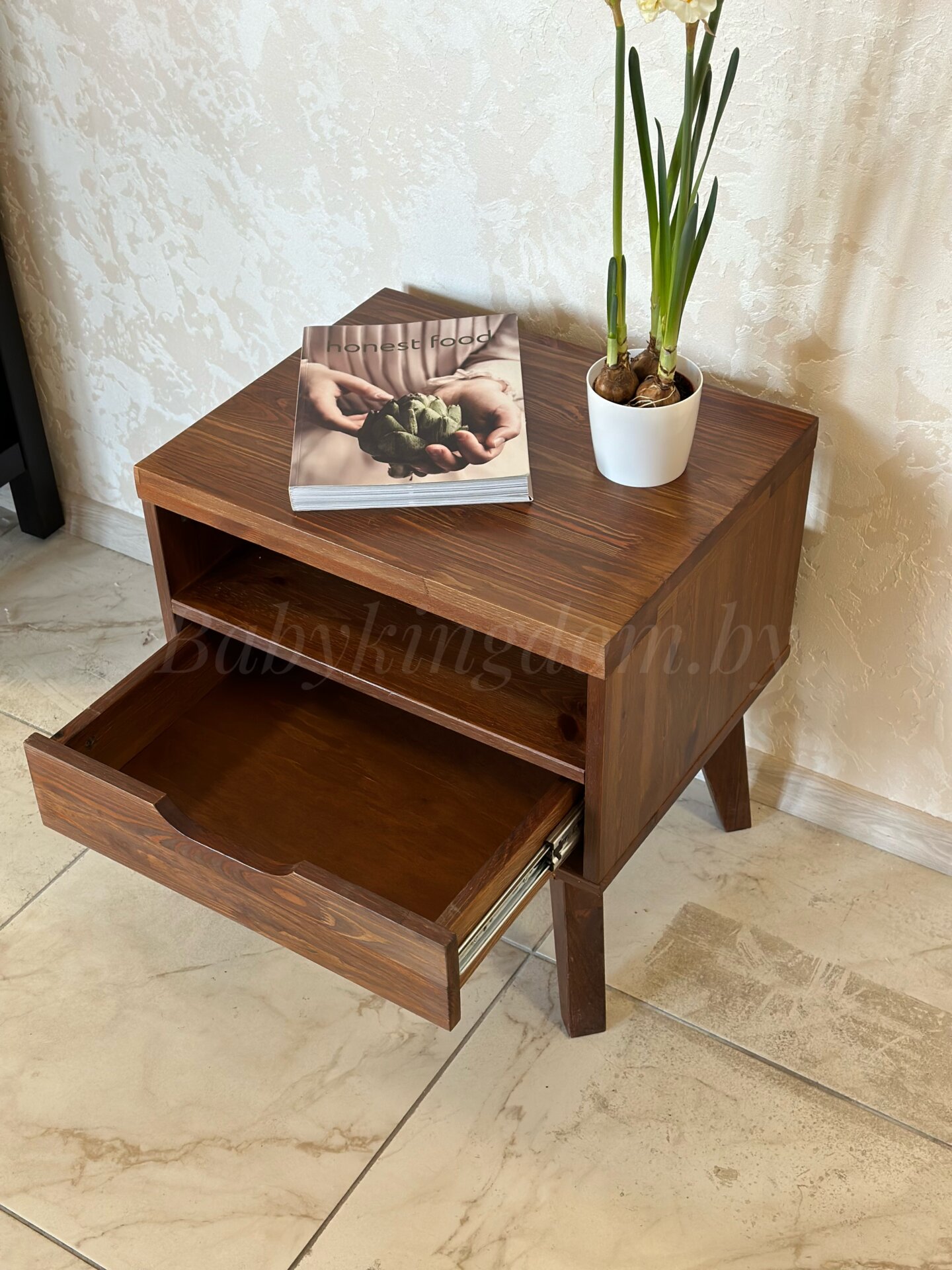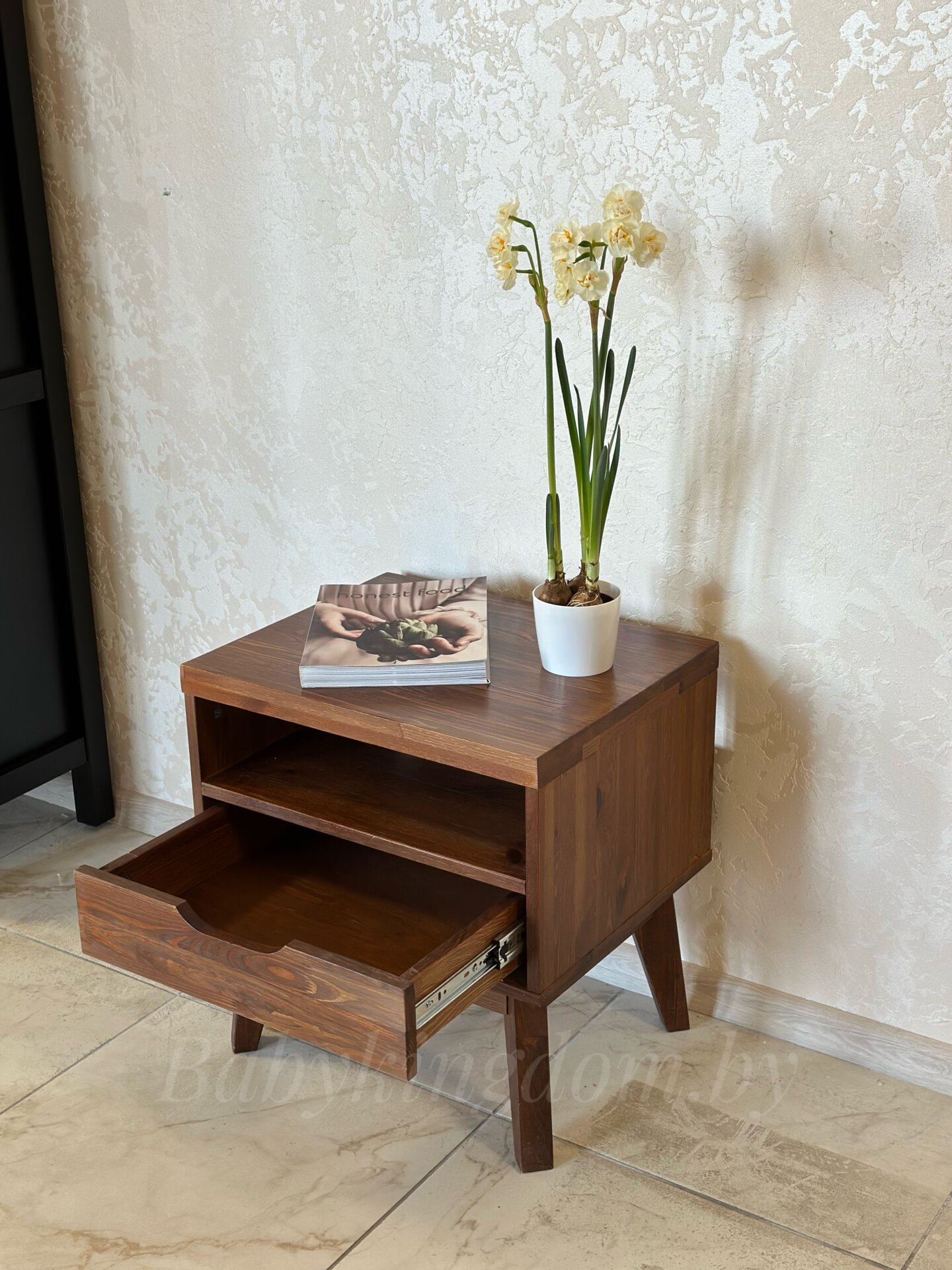 Тумба оборудована небольшим выдвижным ящиком и открытой нишей.