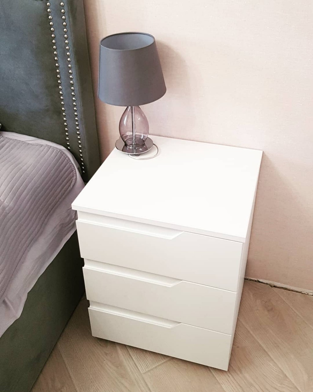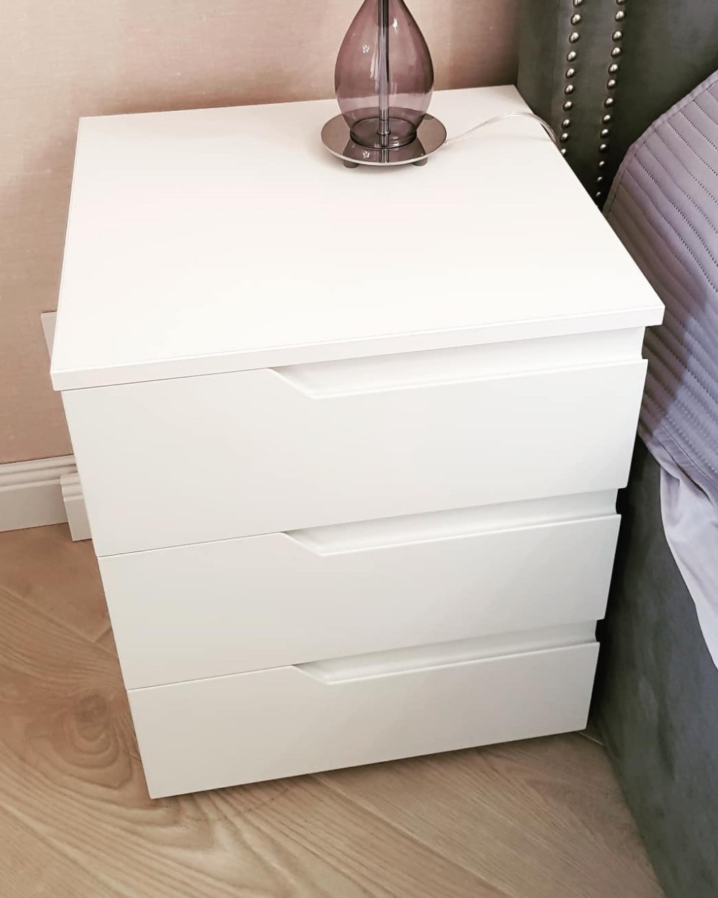 Для удобства пользования, прикроватная тумба в спальню из ДСП Egger оснащается интегрированными ручками. Во вместительных выдвижных полках можно храниться разнообразные книги, сувениры, аксессуары и любую мелочь, которая может пригодиться и всегда будет под рукой. Фасад выполнен из крашенного в белый цвет МДФ. Цвет легкий и свежий, совершенно ненавязчивый, создающий в комнате приятную атмосферу.