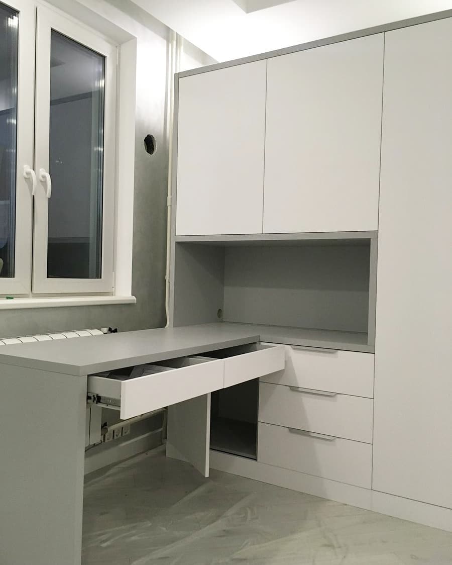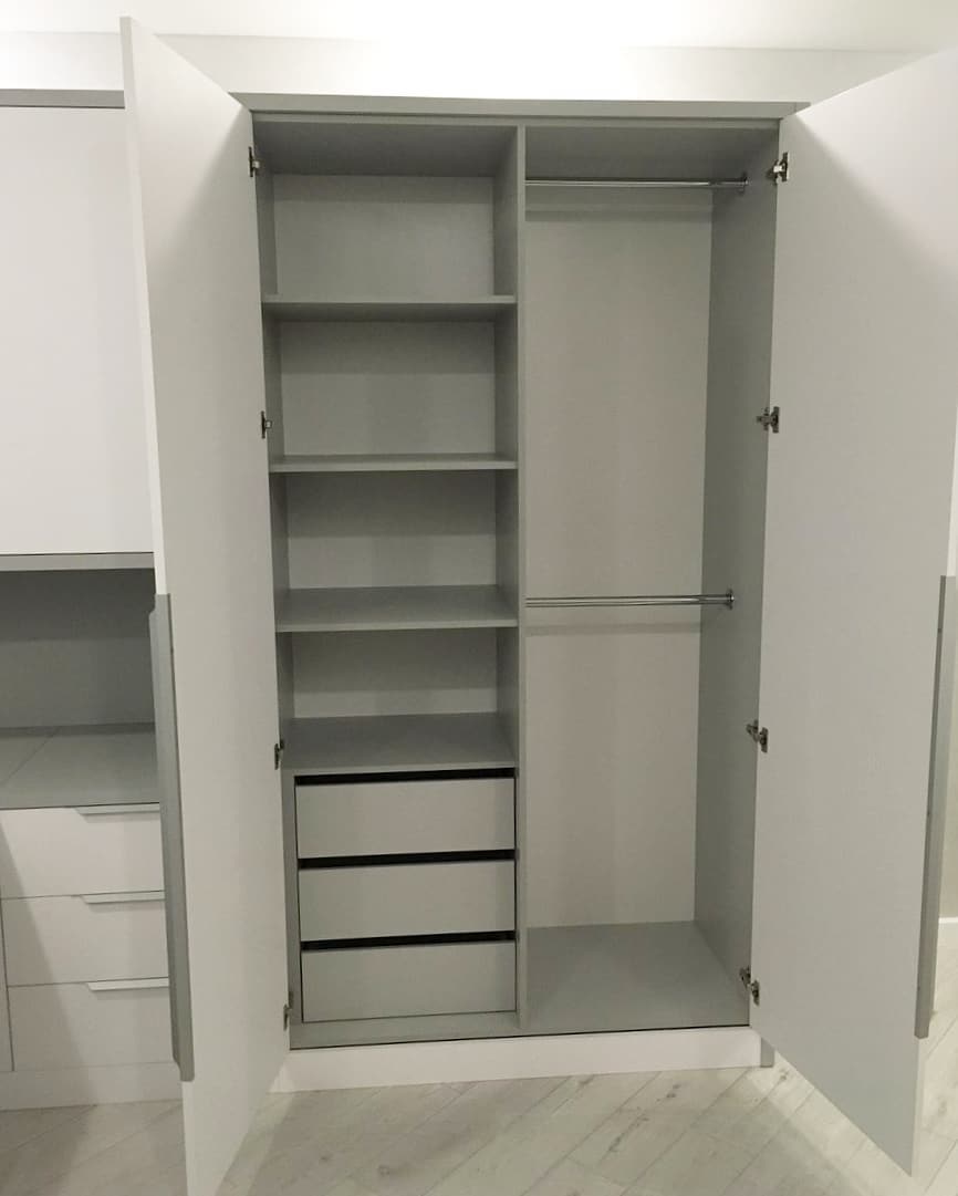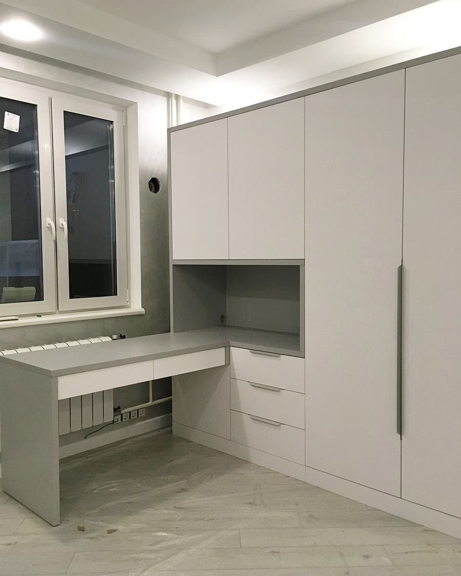 код 115156Двухдверный распашной шкаф, стол, выдвижные ящики, открытая ниша, шкафчики без ручек.