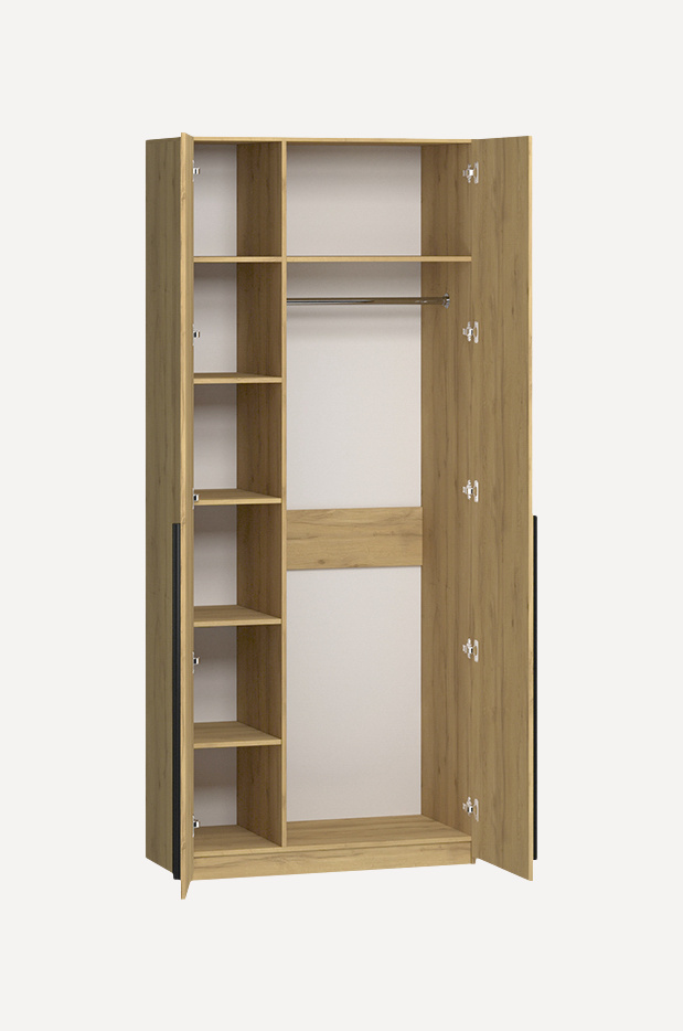 Два отделения для одежды со штангами и шесть полок для других вещей.