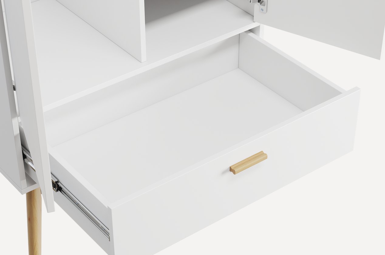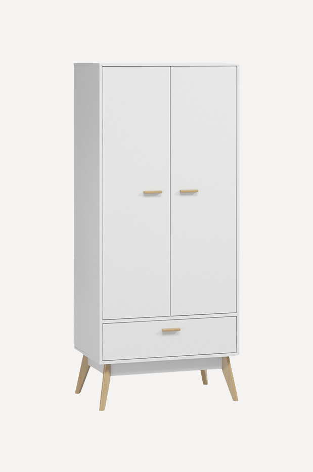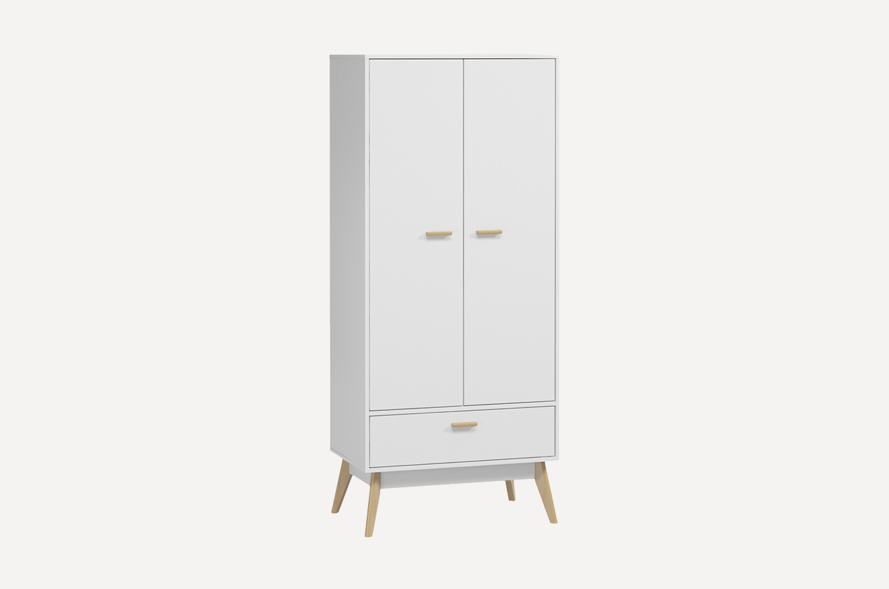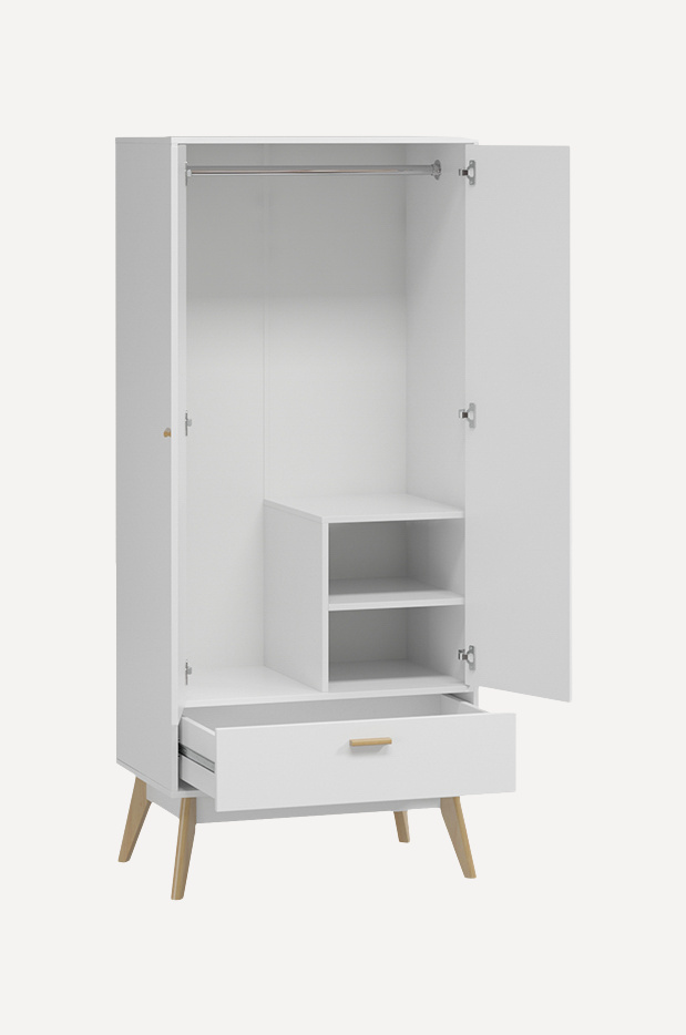 Вместительный и удобный распашной шкаф «Нордик» сочетает в себе продуманную конструкцию и современный дизайн. Внутри шкафа комфортно расположены полки и штанга для вешалок, а в нижней части находится выдвижной ящик. Благодаря отсутствию в конструкции сложных элементов и простой прямоугольной форме шкаф не выглядит массивным, а высокие ножки и белые матовые фасады выгодно дополняют образ.
