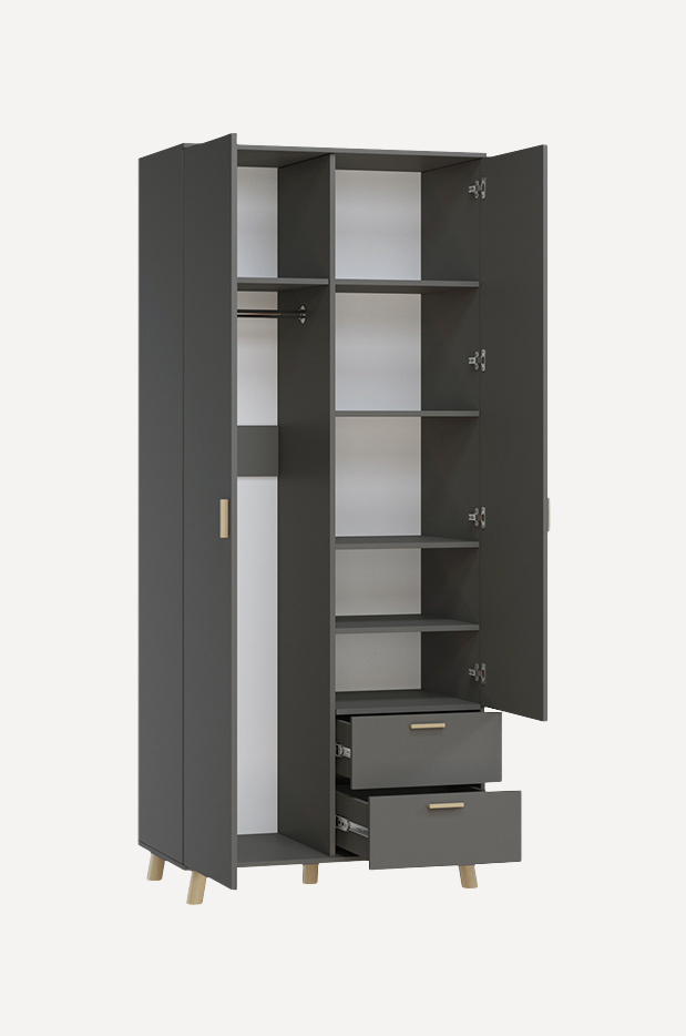Распашной шкаф – классическое решение для хранения одежды и личных вещей. Надежность и простота конструкции гарантируют долгий срок службы, а грамотное внутреннее наполнение – вместительность и легкий доступ к содержимому. Современный дизайн корпуса и фасадов позволят легко разместить модель в интерьере любой комнаты: гостиной, спальни, прихожей и даже офиса.
