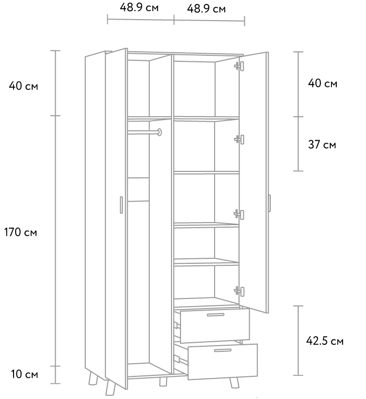 Два отделения для одежды со штангами и шесть полок для других вещей.