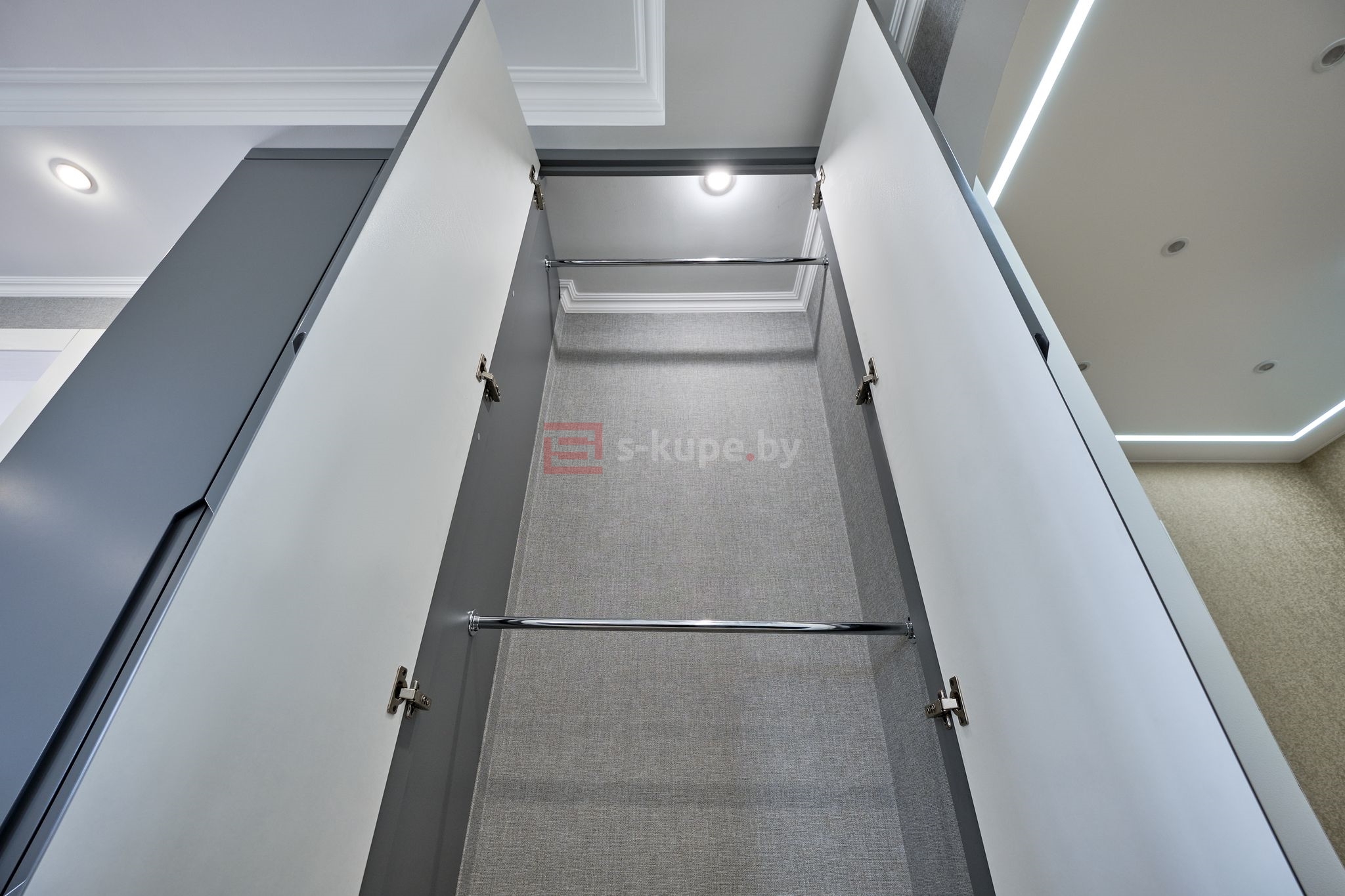 код 105870Матовые фасады с фрезерованными ручками. Две штанги и полки.