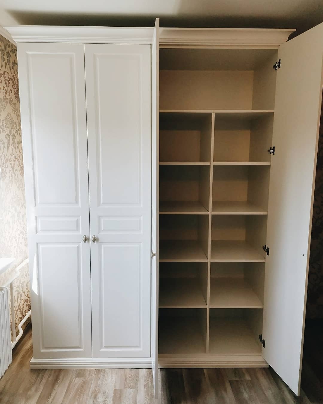 Наличие больших зеркал. Штанги для верхней одежды, выдвижные ящики и полки.