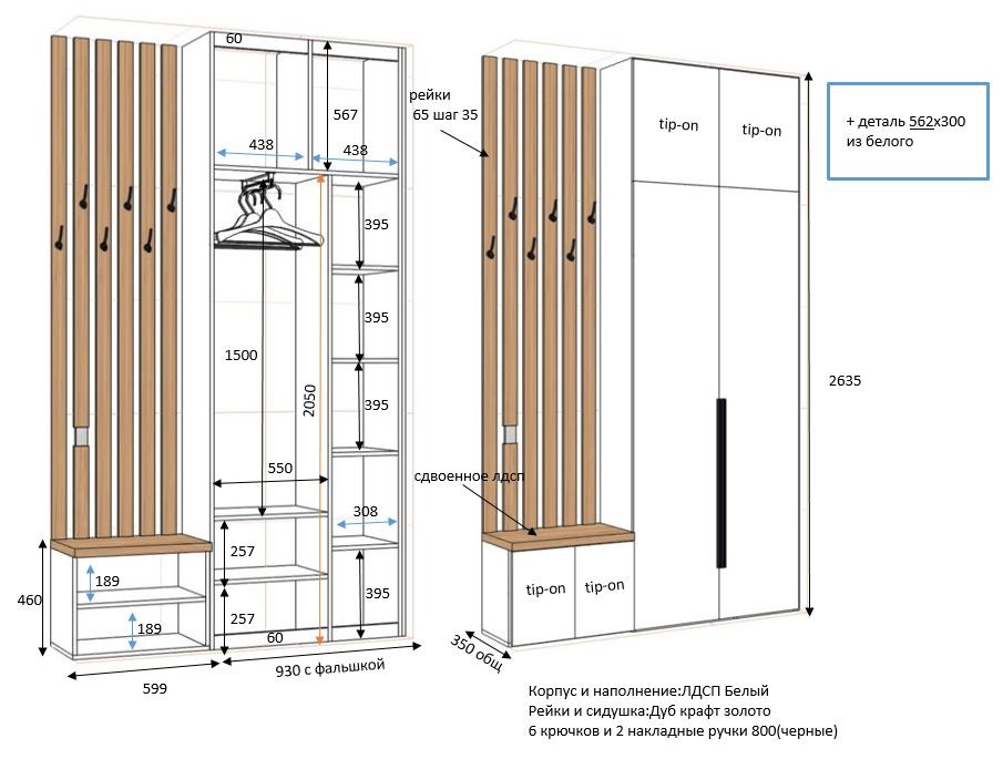 Размер тумбы: ширина 599мм,высота 460(сидушка со сдвоенного ЛДСП), глубина с фасадом 350мм