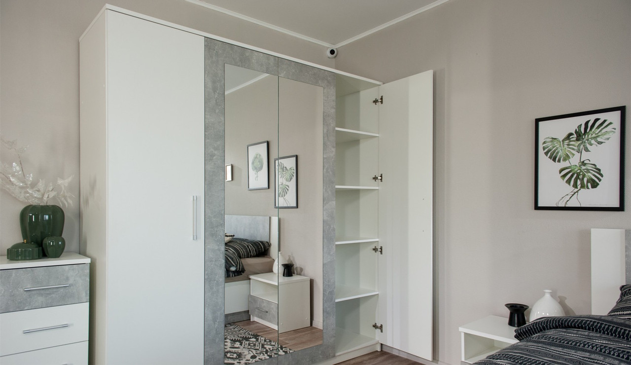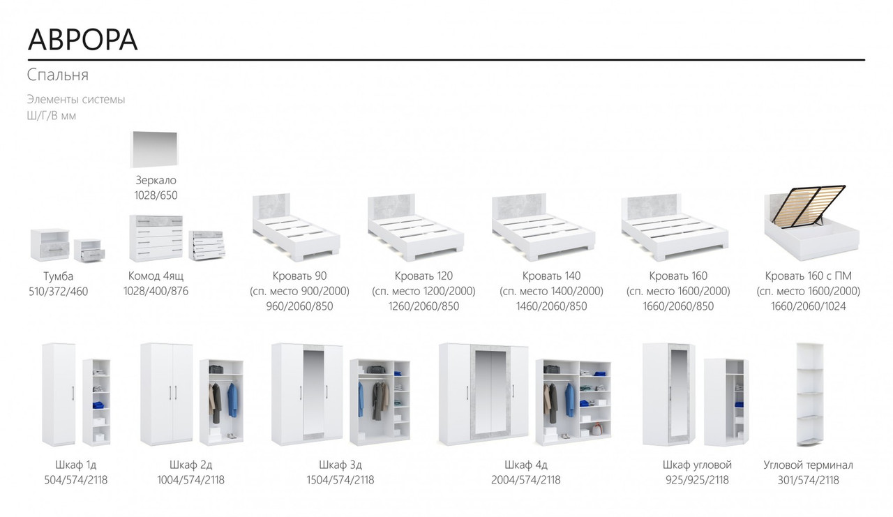 В спальне Аврора пять вариантов шкафов с распашной конструкцией дверей, силиконовыми отбойниками, полками и металлической овальной штангой.