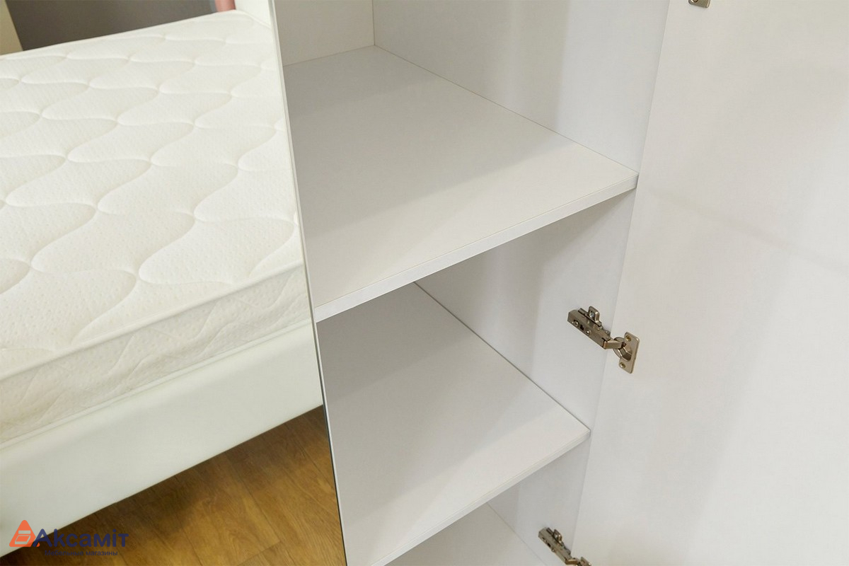 Распашной шкаф для одежды Линда сочетает в себе высокую функциональность и эффектный внешний вид. Изделие выполнено в современном стиле. Зеркальные и глянцевые фасады визуально расширяют пространство, добавляют света в помещение. Внутри шкафа предусмотрено несколько разноплановых секций, включая полочки для белья и отделение со штангой. Оттенок Белый снег универсален, черные мебельные ручки прямоугольной формы создают интересный контраст и завершают образ изделия.