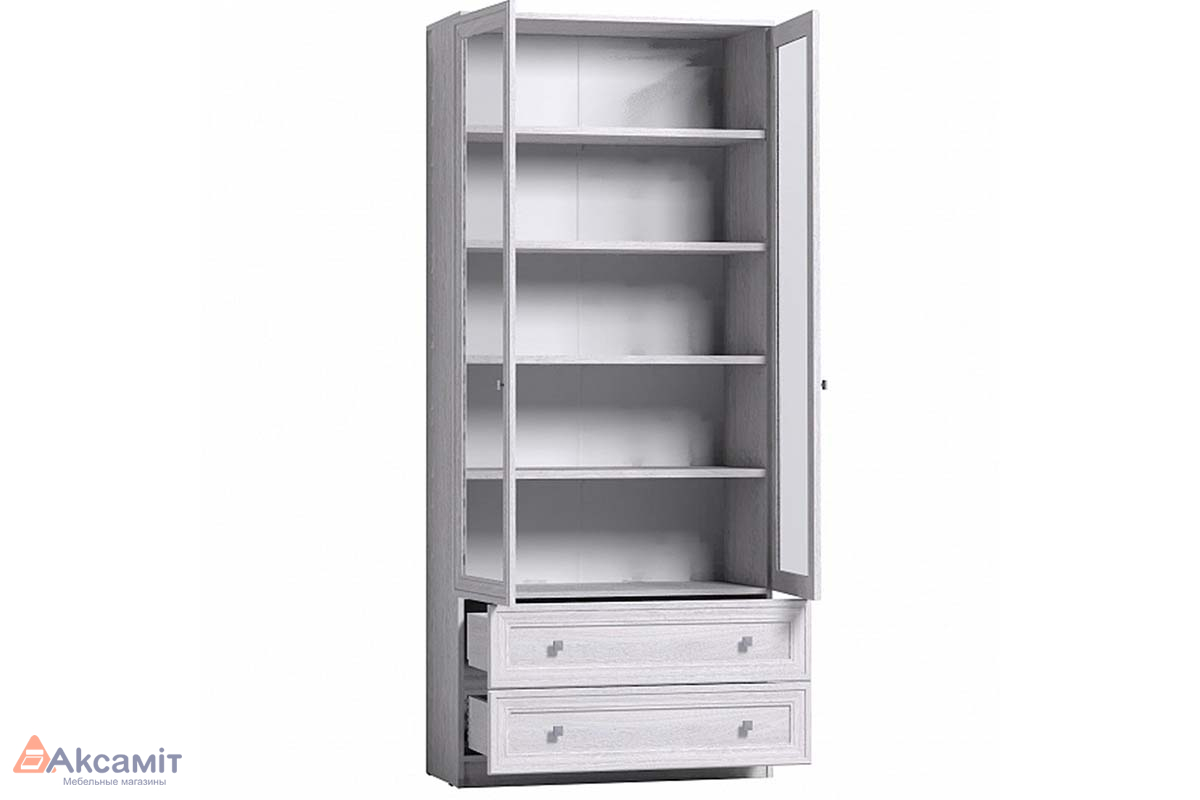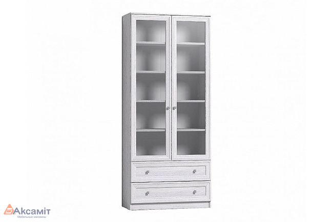 Габаритный книжный шкаф с вместительным отделением для книг с четырьмя полками за двумя застекленными тонированным стеклом распашными дверцами и двумя нижними вместительными выдвижными ящиками. Фасады декорированы рельефным профилем и оригинальными металлическими ручками. Ящики оснащены шариковыми направляющими и выдерживают нагрузку до 20 кг. Полки шкафа регулируемые по высоте и выдерживают нагрузку до 7 кг. В основании шкафа - цоколь с подпятниками, защищающими напольное покрытие. Для предотвращения опрокидывания предусмотрено крепление к стене за подвесы.