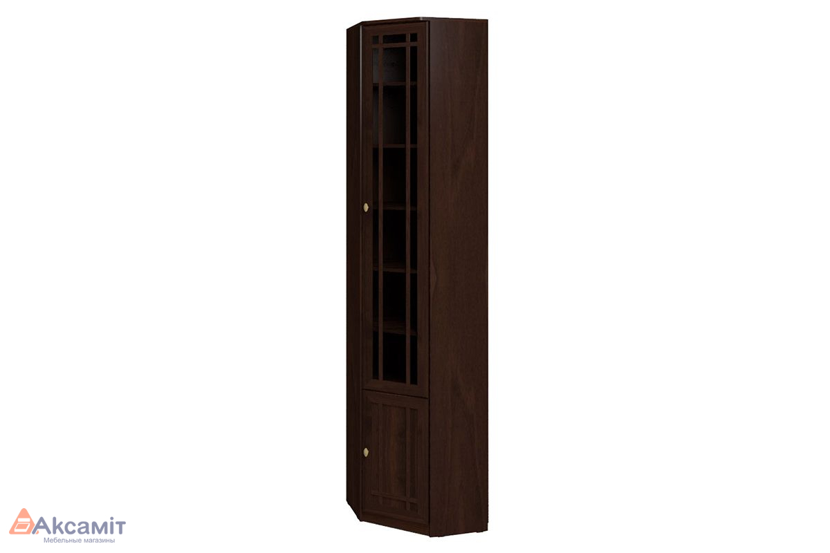 код 117015Угловой книжный шкаф в темном цвете. Широкие треугольные полки внутри.