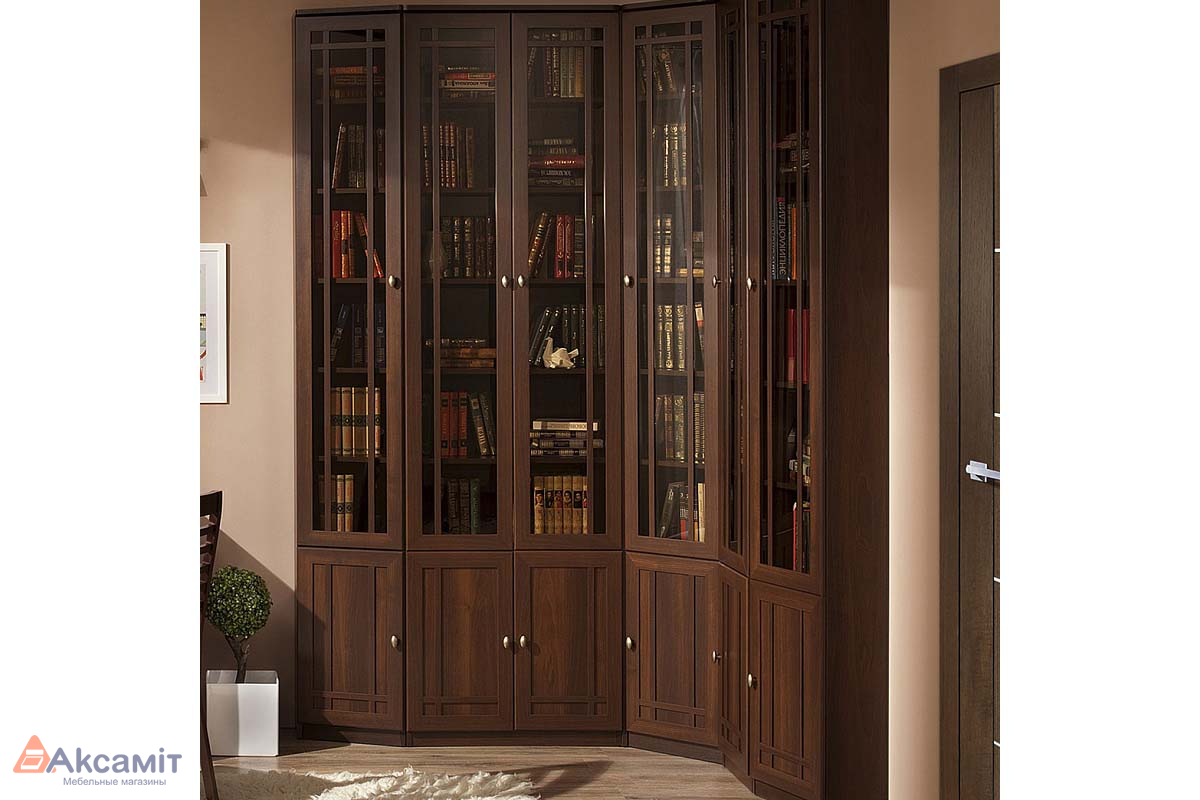 Высокий книжный шкаф для угловой композиции домашней библиотеки. Можно установить в комнату с высотой потолка не менее 240 см. Широкие треугольные полки позволят хранить в библиотеке папки с документами, шкатулки с семейным архивом и фотографиями. Высота полок во всех шкафах для книг регулируется, для этого необходимо только установить полкодержатели на нужной высоте в подготовленные отверстия. Это позволит поставить на полки книги и альбомы разного формата. Тонированное стекло защищает книги от вредного воздействия солнечных лучей и убережет их от пожелтения. Двери не перенавешиваются. Книжный шкаф обязательно крепится к стене за подвесы и межсекционной стяжкой с другими шкафами в наборе. Библиотека выпускается без выборки под плинтус, чтобы каждый мог прирезать плинтус индивидуально. В противном случае остаются неаккуратные зазоры между модулем и стеной.
