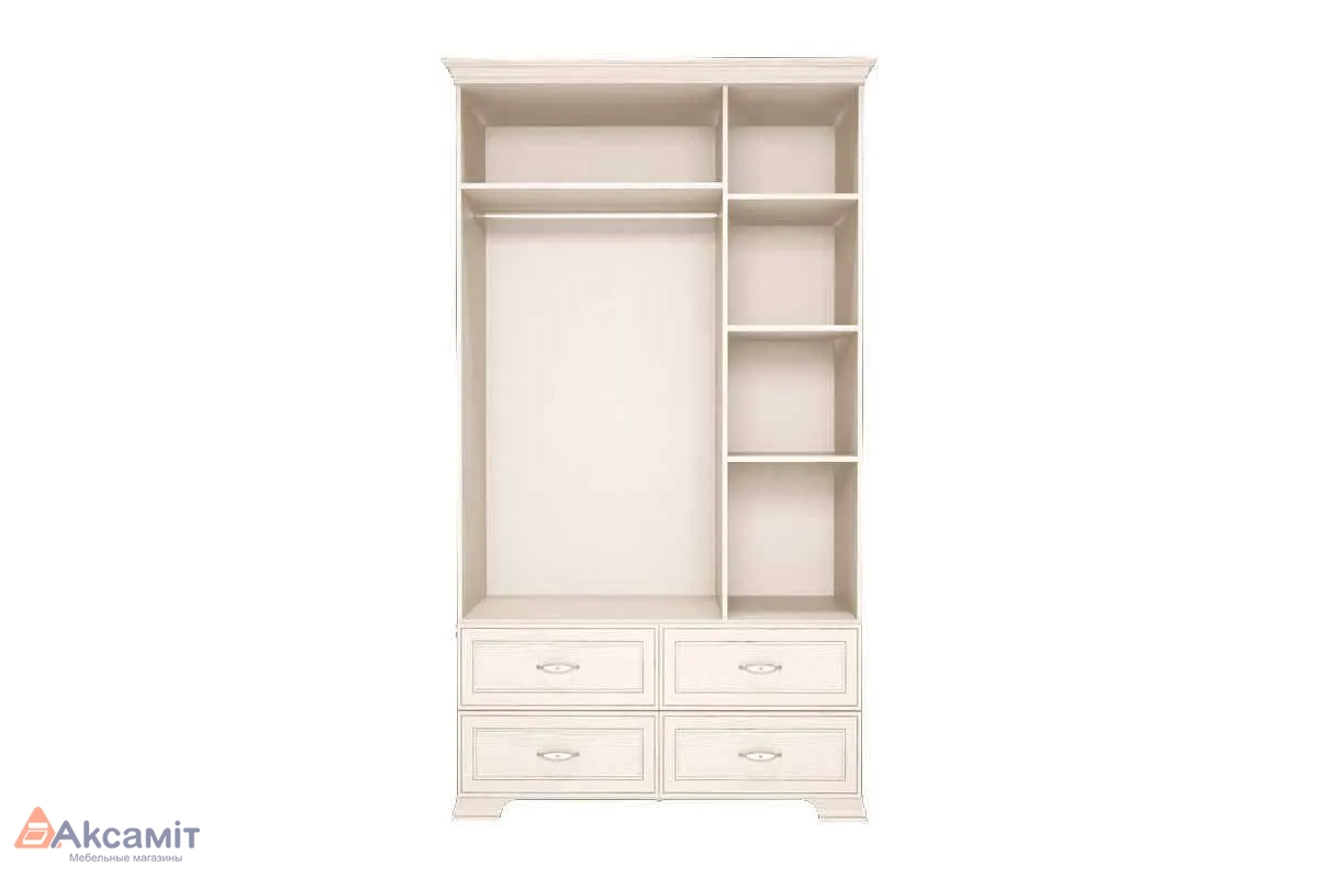 Наполнение: полка закрытая - 3 шт. полка закрытая широкая - 1 штанга для одежды - 1 шт. ящик выдвижной - 4 шт. Дополнительно: к шкафу можно заказать среднюю зеркальную дверь и комплект наполнения, который крепится к боковой стенке и выполняет функцию стеллажа Стильный трехдверный шкаф Венеция 1 выполнен в классическом стиле и идеально подойдет практически для любого современного дизайна комнаты. Элегантная модель разделена на два отделения: широкое справа с антресольной полкой и штангой для хранения одежды на вешалках; узкое слева укомплектовано тремя полками для постельных принадлежностей и личных вещей. В нижней части шкафа предусмотрены четыре вместительных ящика, которые имеют шариковые направляющие с функцией полного выдвижения. На всех фасадах установлены петли с доводчиками, опоры - регулируемые. Ручки цвета "Хром глянцевый" сделаны из металла и оснащены белыми вставками. Входит в набор мебели для спальни Венеция, выполненный в лучших классических традициях.