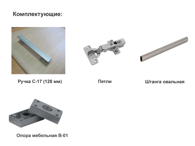 Фурнитура: ручка 128 мм, петли, овальная штанга, мебельные опоры.