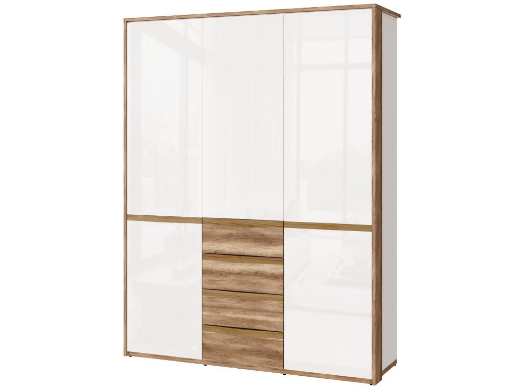 Четыре нижних выдвижных ящика на направляющих плавного выдвижения обеспечат место для белья, спальных принадлежностей и аксессуаров. Боковая секция с распашной дверью и полками позволит разместить сложенную одежду, постельное белье и другие вещи. Дизайн шкафа в стиле минимализм подарит Вашей спальне простор и наполнит комнату легкостью. Сочетание светлых тонов с натуральным деревом подчеркивают eco-friendly направленность этой коллекции.