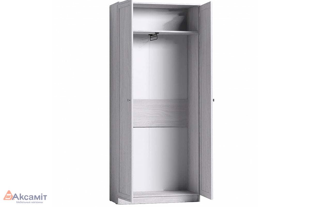 Компактный двустворчатый шкаф с антресольной полкой и с выдвижной штангой за двумя распашными дверцами. Фасады шкафа декорированы рамочным рельефным профилем и оригинальными металлическими ручками. В основании шкафа - цоколь с подпятниками, защищающими напольное покрытие. Для защиты от опрокидывания предусмотрено обязательное крепление шкафа к стене за подвесы.