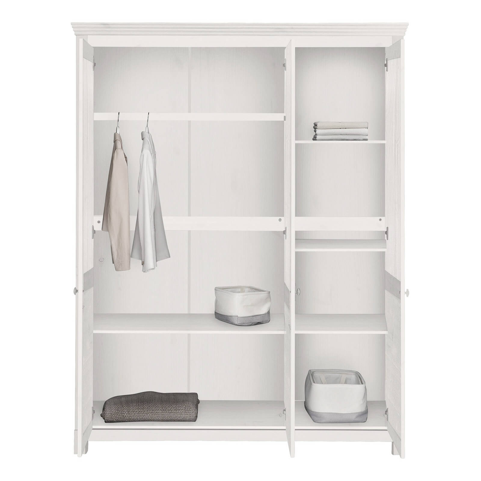 Этот шкаф из коллекции Рауна с тремя створками хорошо подходит для интерьера в скандинавском стиле. От отличается стильным и функциональными дизайном, а его наполнение позволяет хранить в порядке все ваши любимые вещи: здесь есть секция для верхней одежды со штангой, отделение с 4 полками, место под обувь.