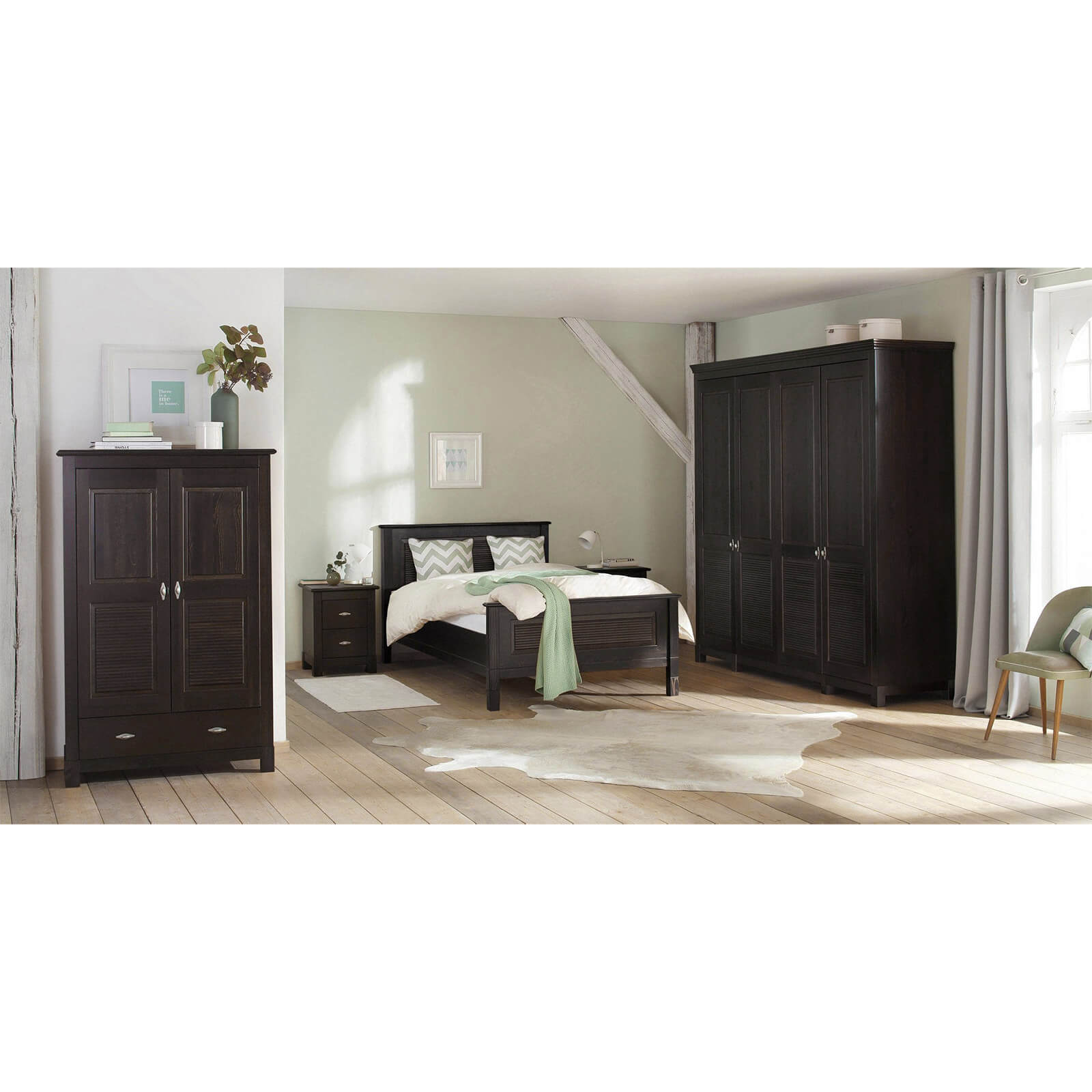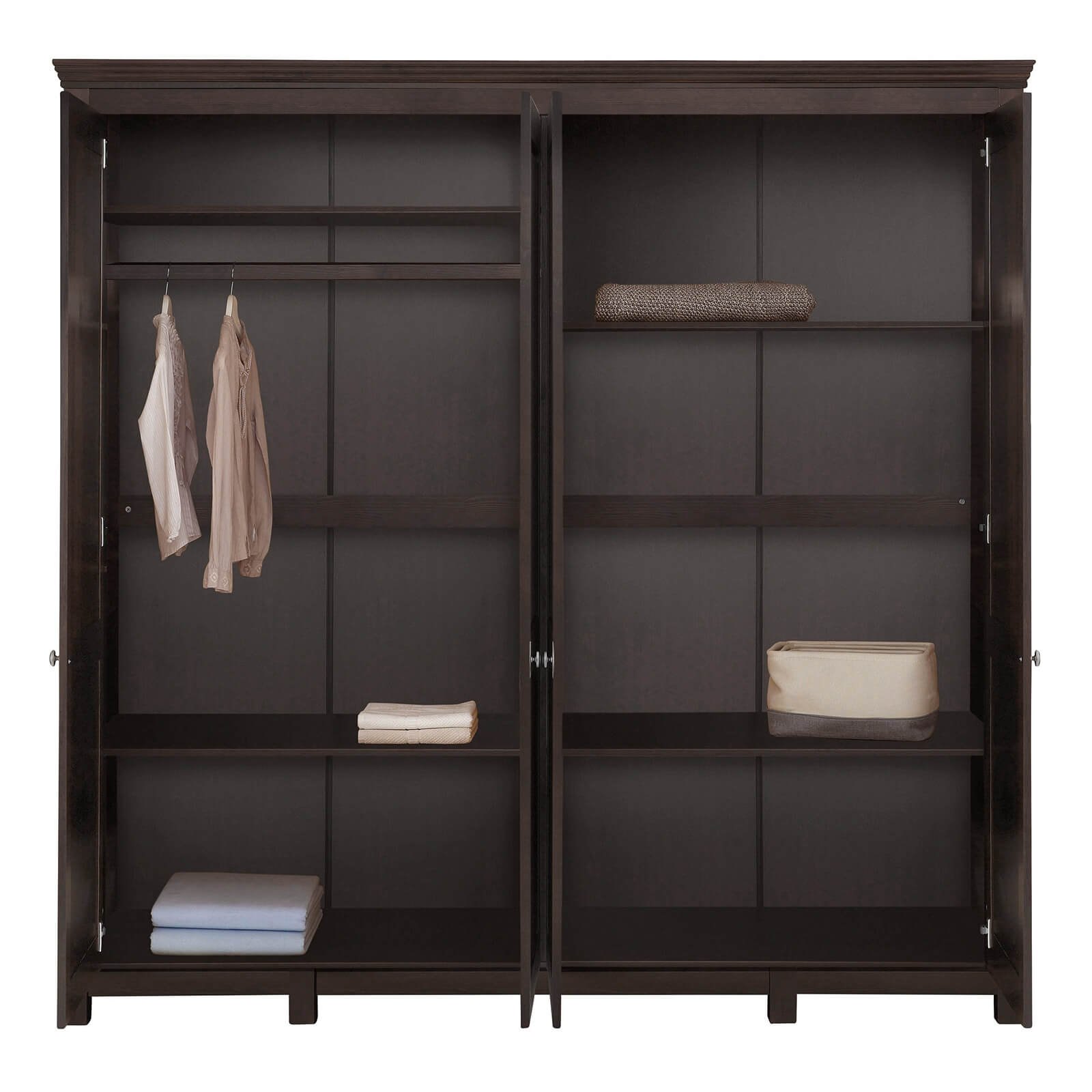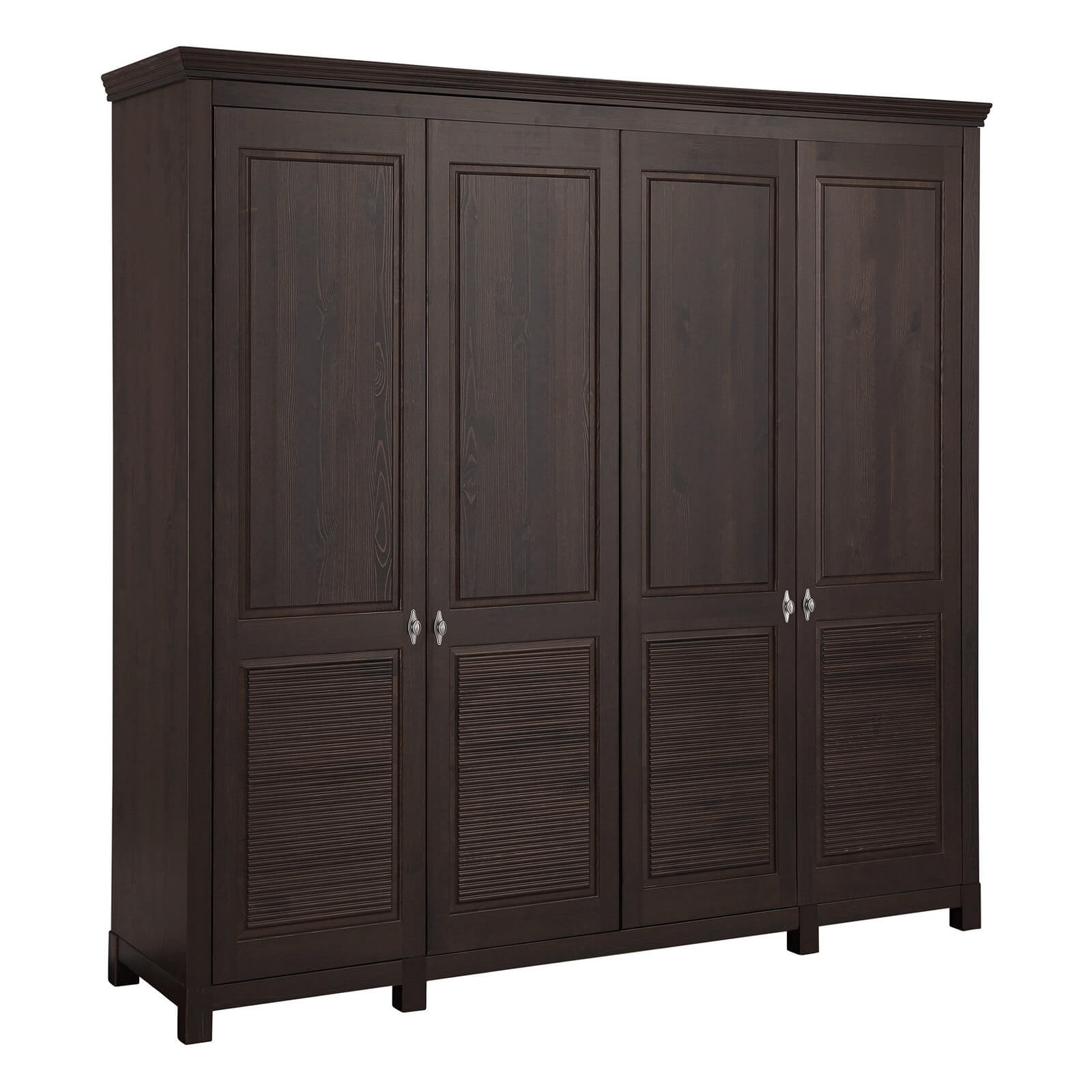 Это большой четырехдверный шкаф для внушительного гардероба! Внутри широкое отделение со штангой и местом под головные уборы, а также четыре вместительные полки для других вещей. Распашные двери – глухие, но с оригинальным декором. Завершает картину эффектная фурнитура “под старину”.