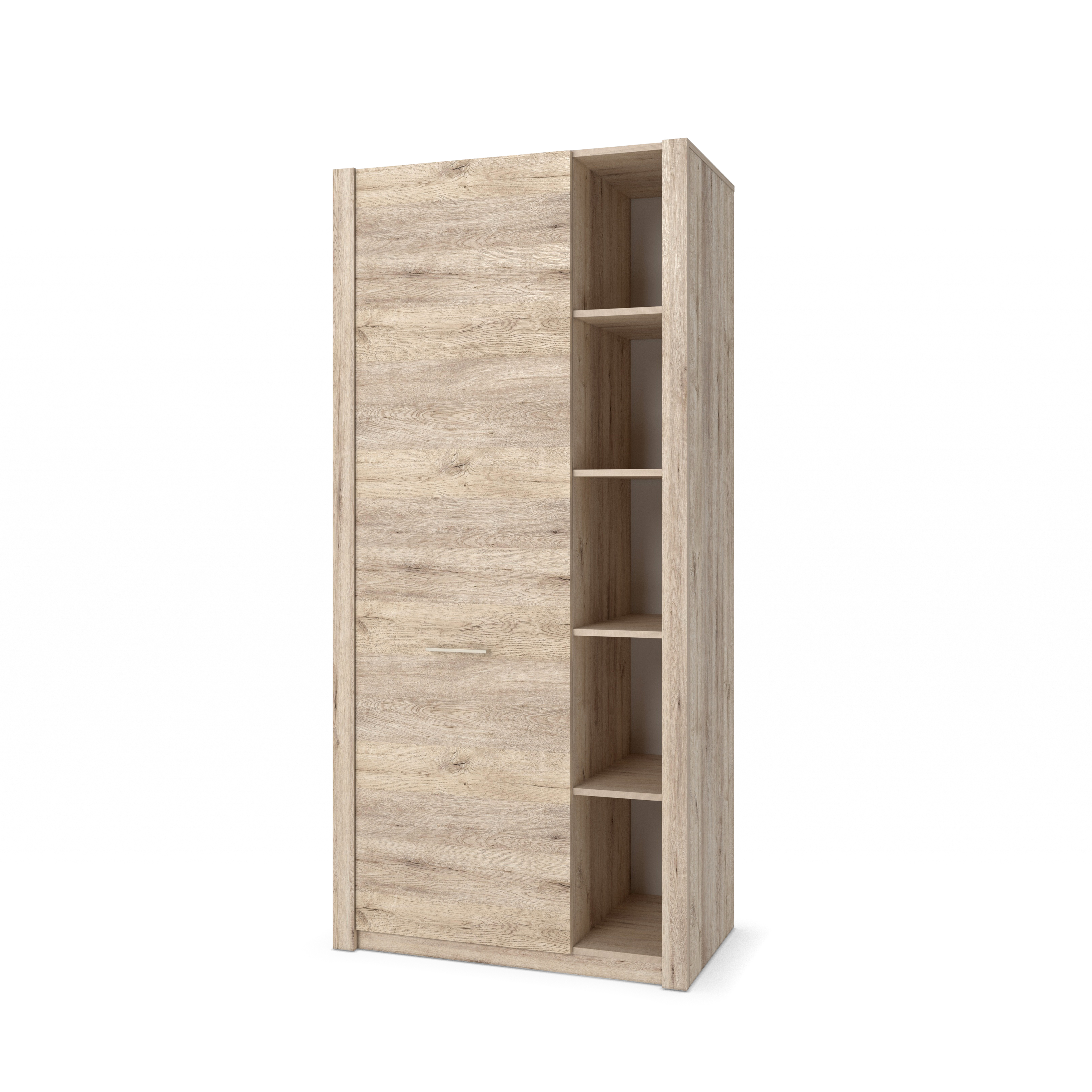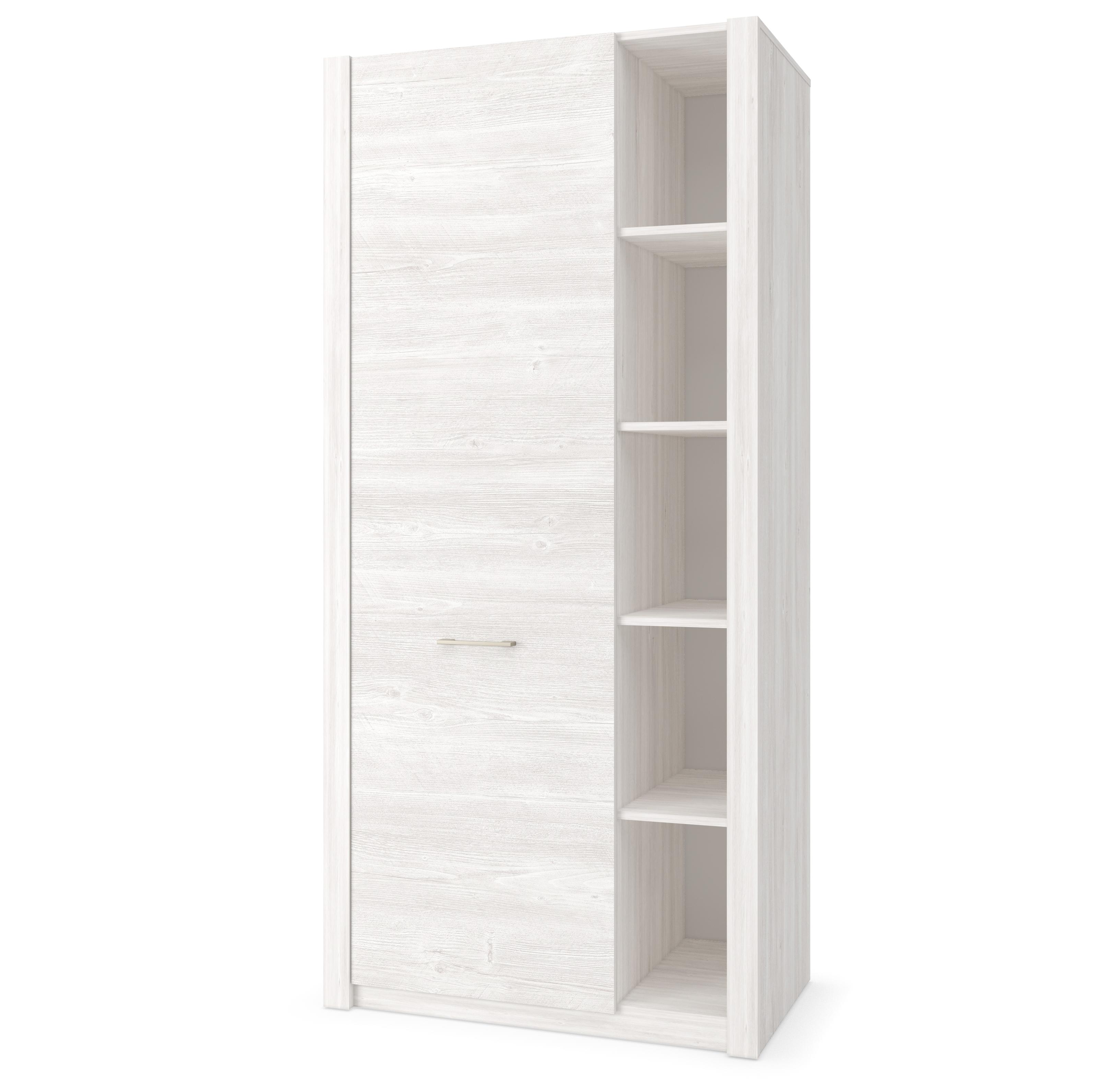 Кроме того, он изготовлен из качественного материала ЛДП и ПВХ, что делает его практичным, удобным и достаточно легким.Данная модель шкафа имеет два основных отделения: одно узкое открытое, второе широкое с дверкой. Каждое отделение оснащено полочками.