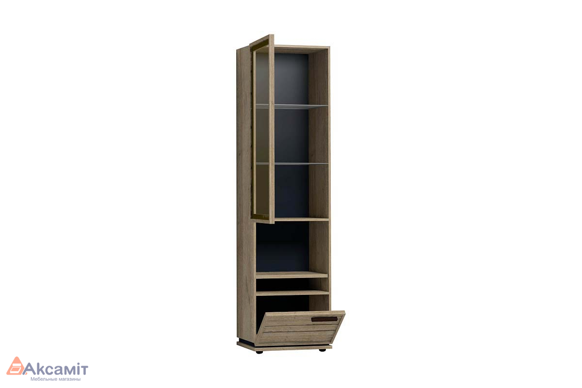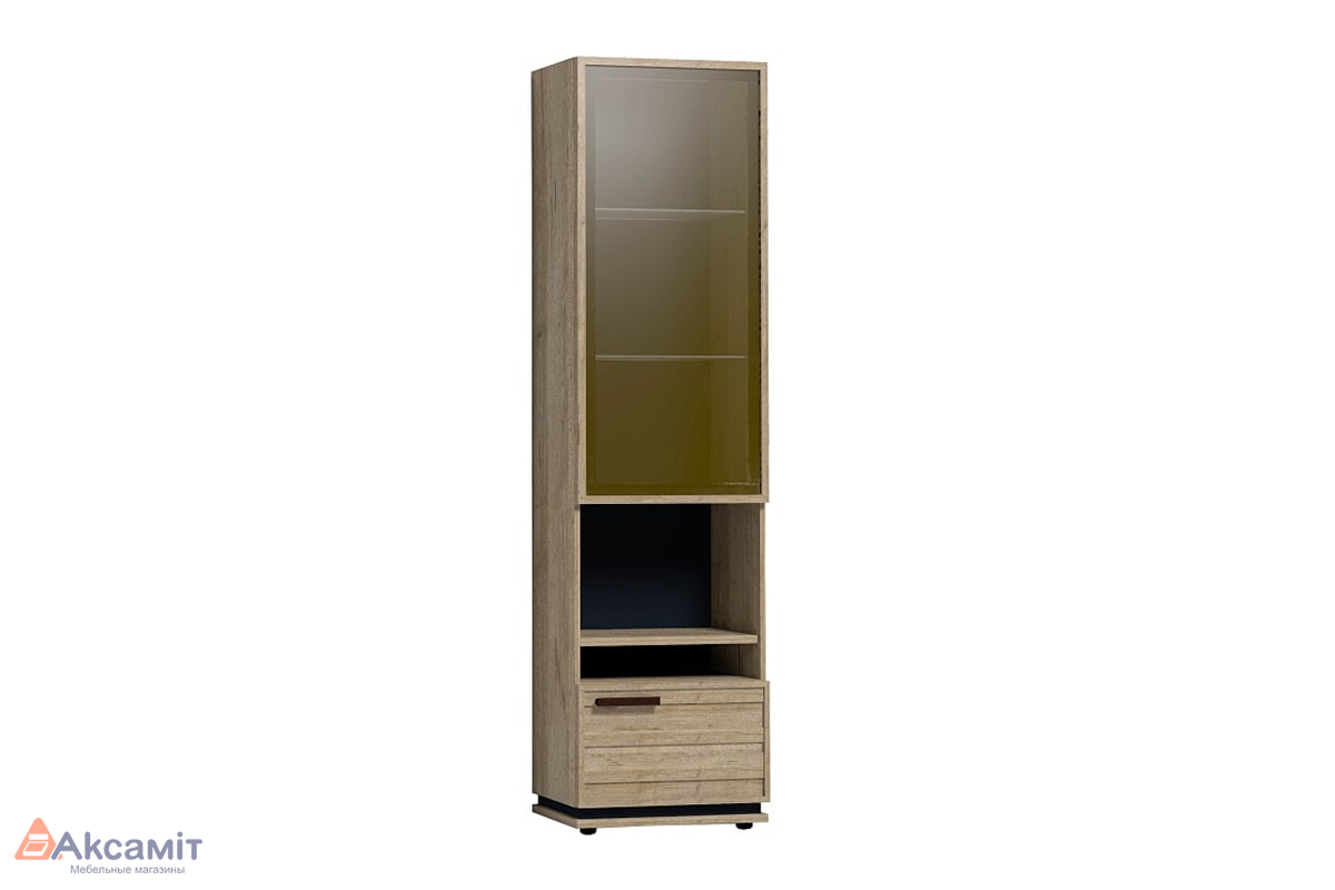 Высокий шкаф для посуды удобен своей функциональностью и эргономичностью конструкции. За тонированным стеклянным фасадом - 2 регулируемые по высоте бесцветные стеклянные полки. Витрина открывается за боковой свес. На открытой полке разместите фотографии или элементы декора, а за глухим откидным фасадом спрячьте документы и ценные вещи от посторонних глаз. Регулируемые опоры шкафа позволят компенсировать незначительные неровности пола.