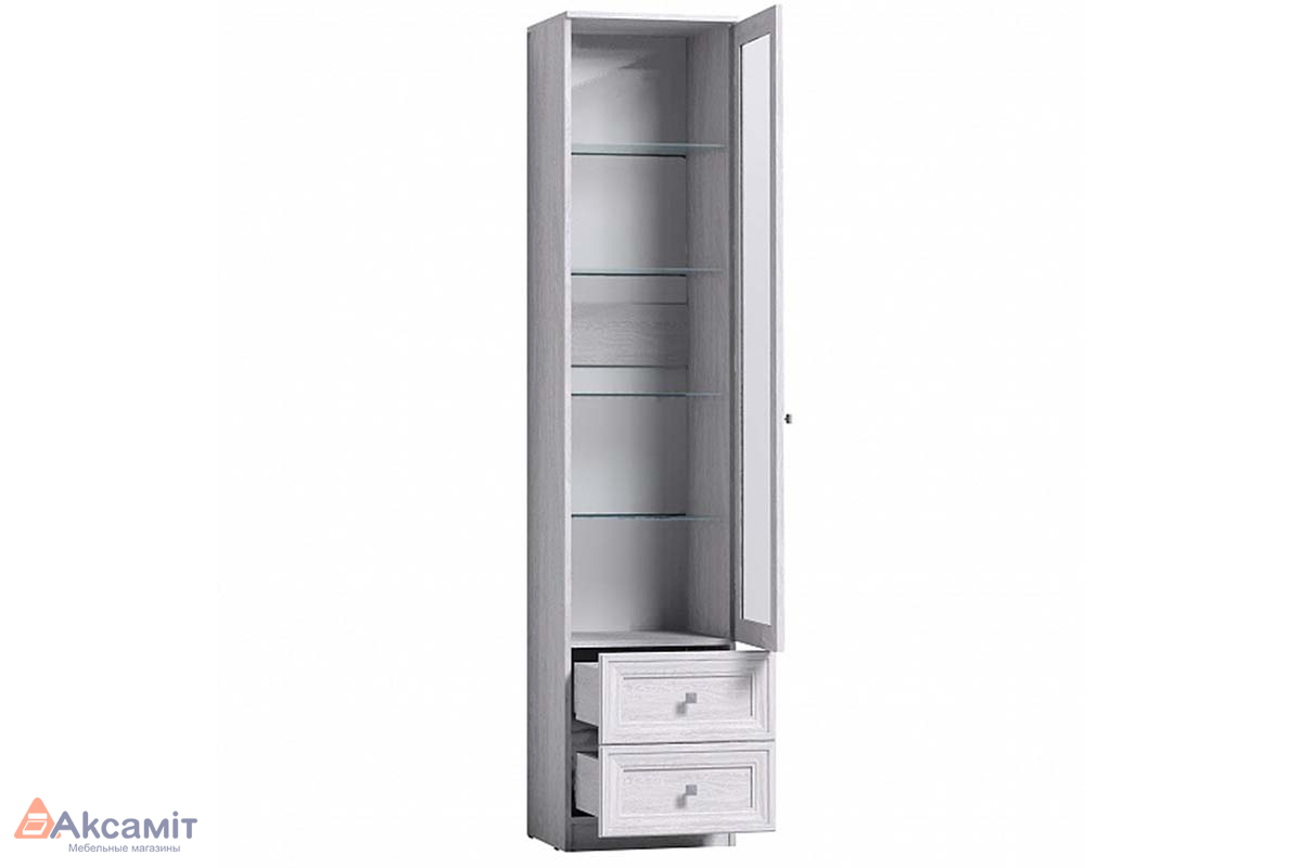 Элегантная комбинированная витрина для посуды с четырьмя стеклянными полками за распашной застекленной дверцей и с двумя выдвижными ящичками в основании. Распашная дверца шкафа выполнена из тонированного серого стекла в обрамлении рельефного профиля. Фасады оснащены оригинальными металлическими ручками.