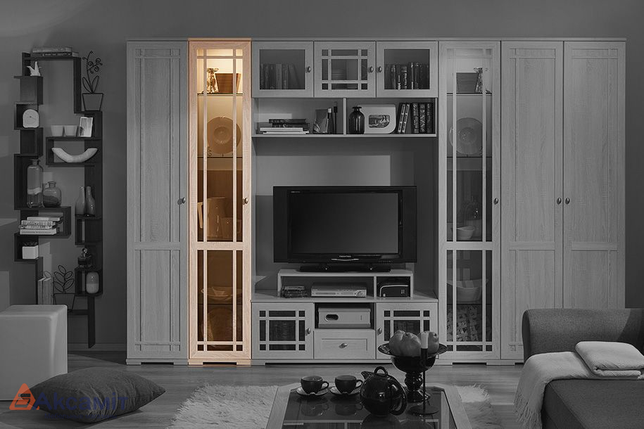 Витрина в гостиной означает, что хозяева любят и ценят семейные традиции. В ней можно выставлять не только посуду, но и фотографии, совместно приобретенные сувениры, красивые интерьерные мелочи или детские поделки. На стеклянных полках толщиной 4 мм с еврокромкой можно разместить любые вещи весом до 10 кг. Встроенная подсветка поможет создать необходимую атмосферу и создать акценты для внимания гостей. Она оснащена трансформатором и подключается к бытовой электросети 220 В. Благодаря переплету из тонкого профиля МДФ дверь не перенавешивается на другую сторону.