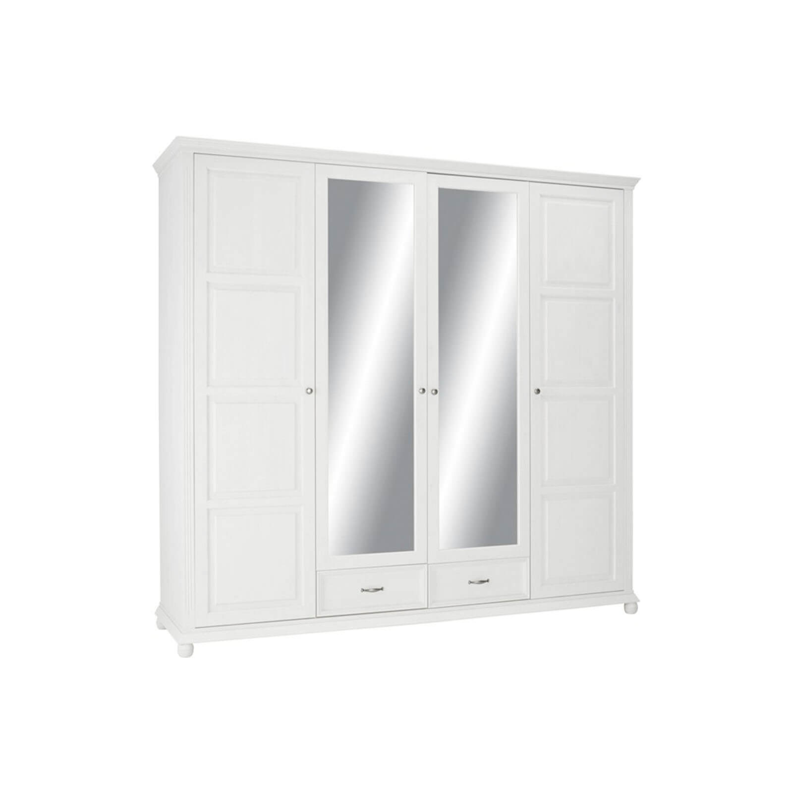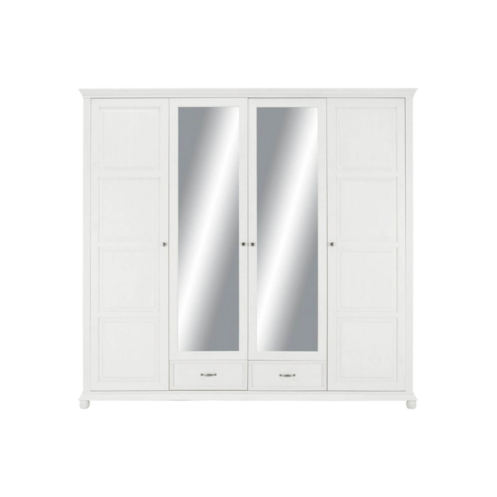 Очень просторный четырехдверный шкаф предлагает максимум для хранения вашей одежды. За четырьмя дверьми вы можете прекрасно хранить футболки, свитера или брюки на семи регулируемых полках. Блузки, платья и рубашки находят свое место на штанге для одежды. В двух ящиках вы можете хранить одежду или аксессуары, которые будут всегда под рукой. В двух полно-размерных зеркалах вы можете посмотреть на свой наряд, прежде чем покинуть дом. Зеркальные двери также визуально расширяют пространство помещения.