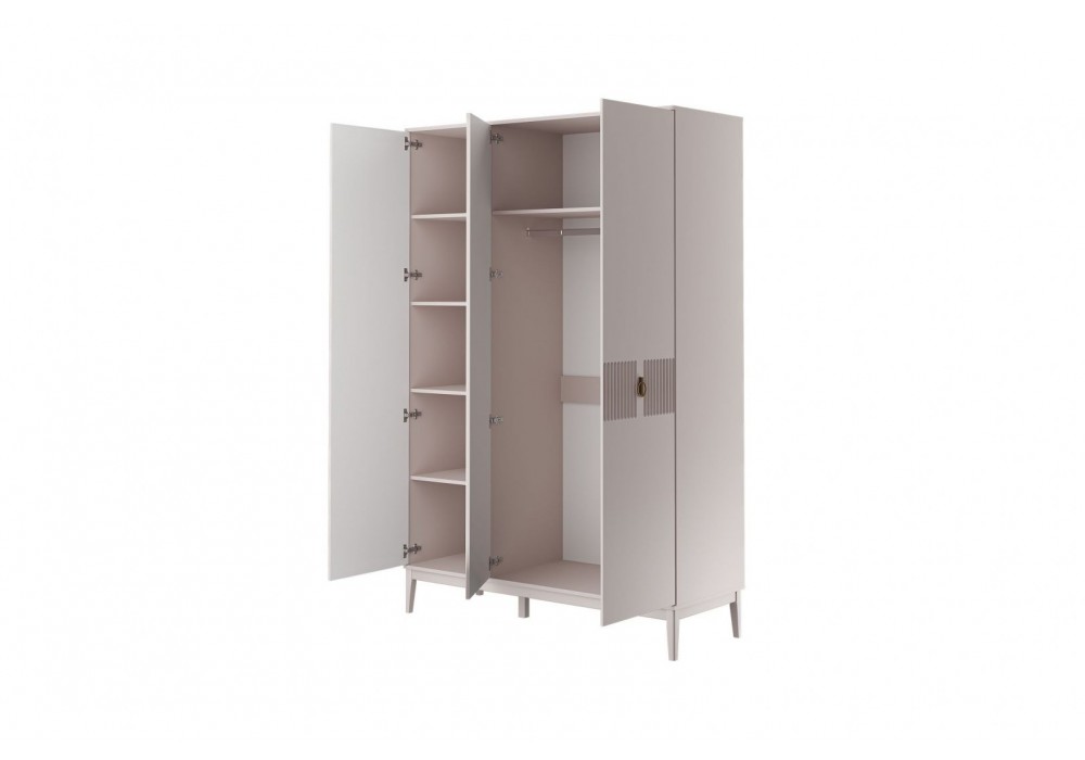Фасады выполнены из МДФ и покрыты эмалью льняного цвета. Корпус ЛДСП в цвете "Персидский жемчуг". Стиль коллекции задает модная вертикальная фрезеровка фасадов и оригинальная фурнитура золотого цвета.