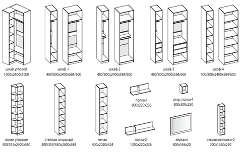 Ширина шкафов 400 мм или 800 мм. Высота — 2400мм. глубина с фасадом 600 мм, без фасада 584 мм. Наполнение смотрите на фото.