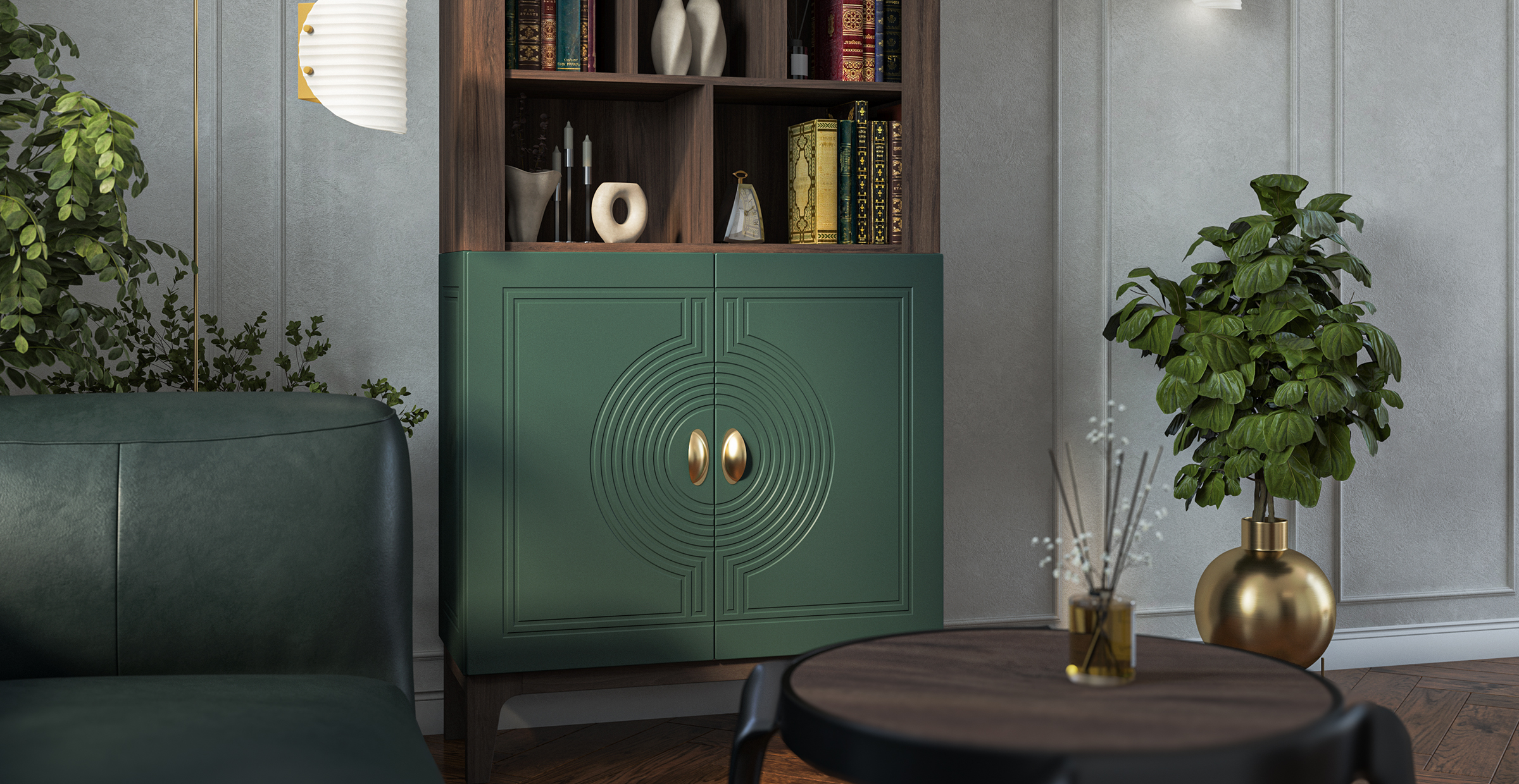 Сочетание насыщенного корпуса Гикори Прадо и акцентного фасада Комбу Грин формирует образ, в котором выразительность встречается с утончённостью. Тёплая древесная текстура наполняет интерьер уютом, а глубокий зелёный фасад придаёт пространству характер и индивидуальность.