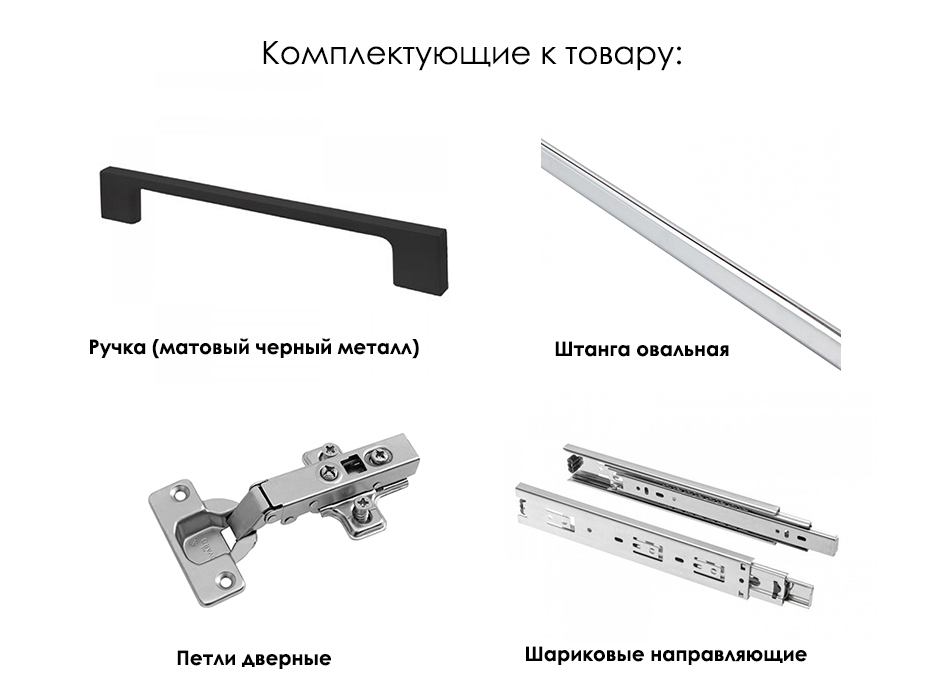 Фурнитура: ручка металлическая черная матовая, шариковые направляющие, петли дверные, штанга овальная.