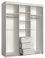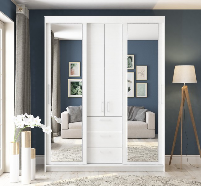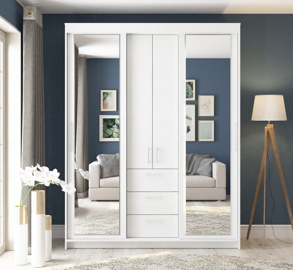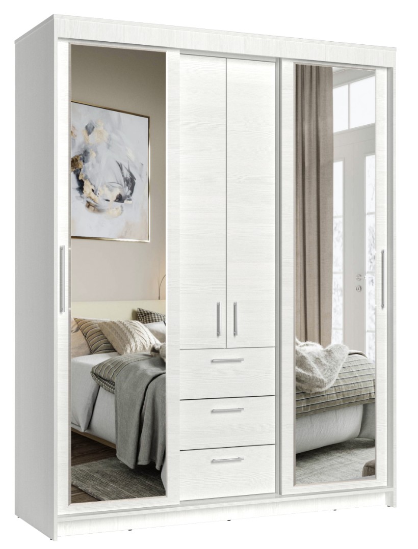 Белый шкаф для спальни изготовлен из ламинированной ДСП и имеет фасады с едва заметной фактурой. Шкаф имеет четыре распашные створки и три выдвижных ящика, по бокам оборудован зеркалами в полный рост. Ручки металлические серебристые, внутри шкафа имеются две штанги для вешалок и полочки для белья.