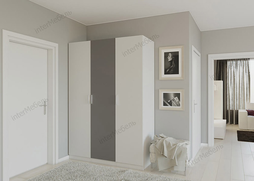 Модульный шкаф с распашными дверями изготовлен из ламинированной ДСП с глянцевым покрытием. Расцветка фасада выполнена в комбинации белого и серого цветов. Шкаф представляет собой сборную конструкцию из трех отдельных модулей, два из которых имеют наполнение в виде антресоли и штанги для вешалок, третий модуль оснащен тремя выдвижными ящиками и полками.