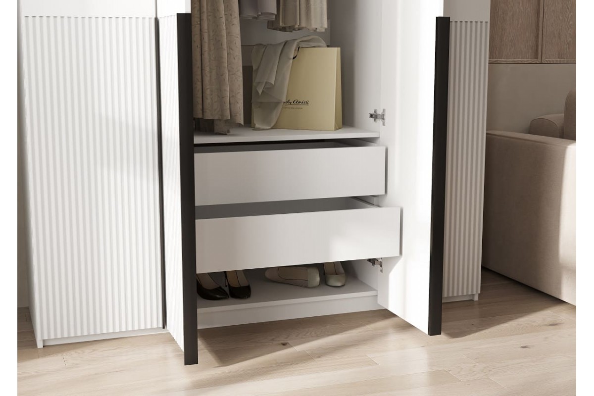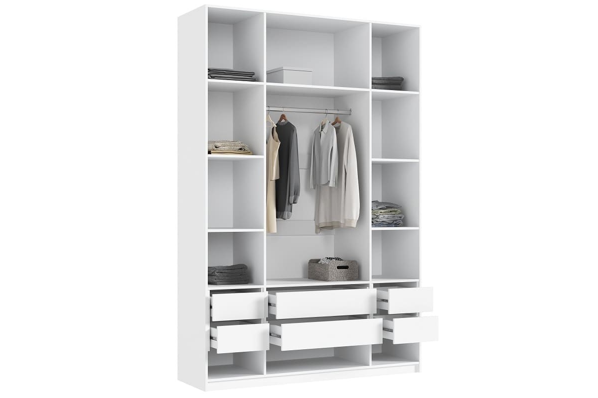 Трехдверный распашной шкаф с фасадными шухлядами.