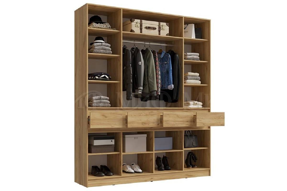 Фасады без ручек, выдвижные ящики, штанги для одежды, открытые полки.