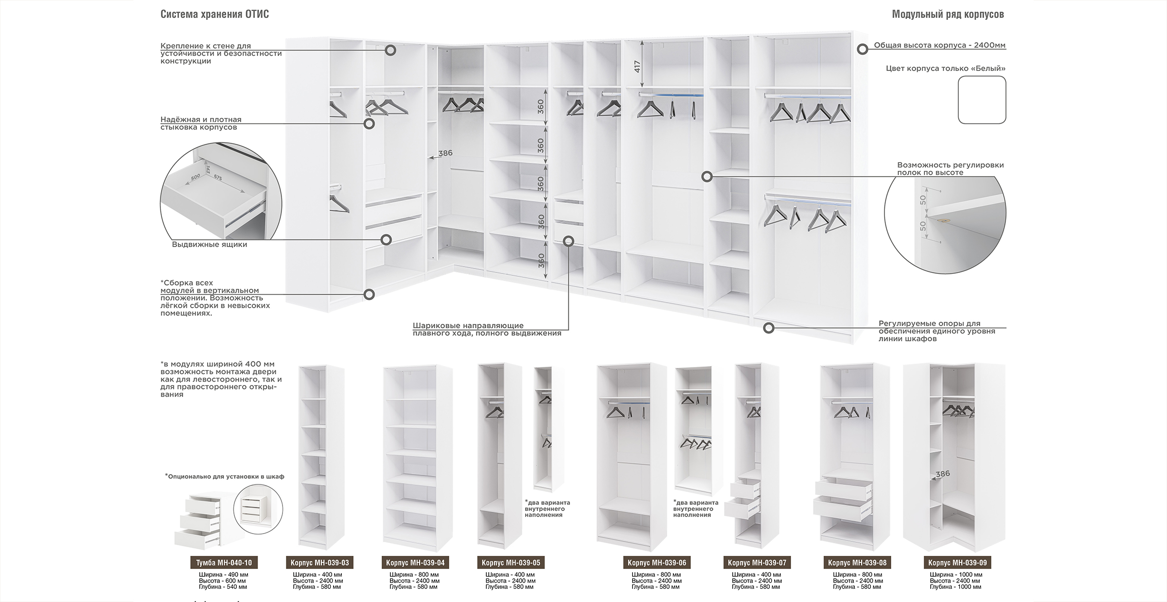 Удобное наполнение с полками, выдвижными ящиками и нишей вешалок.