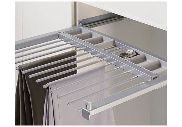 Темный шкаф-пенал для прихожей. Внутри выдвижная вешалка и полки.
