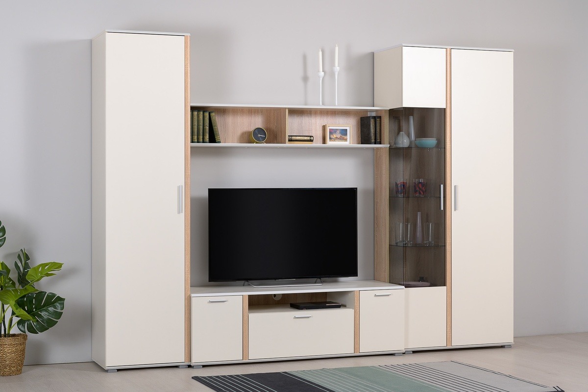 Тёплая и приятная цветовая гамма располагает к уюту и комфорту. Акцентом к основному однотонному цвету выступает популярный декор Дуб Сонома.