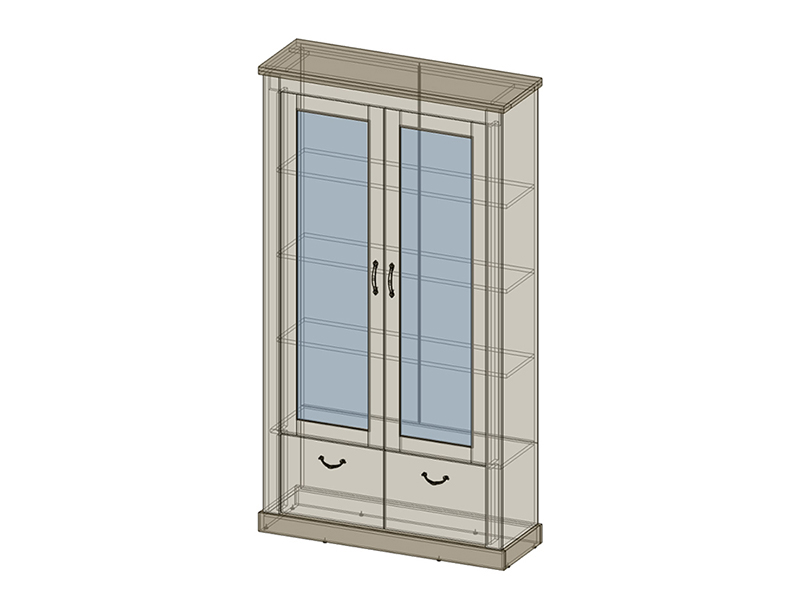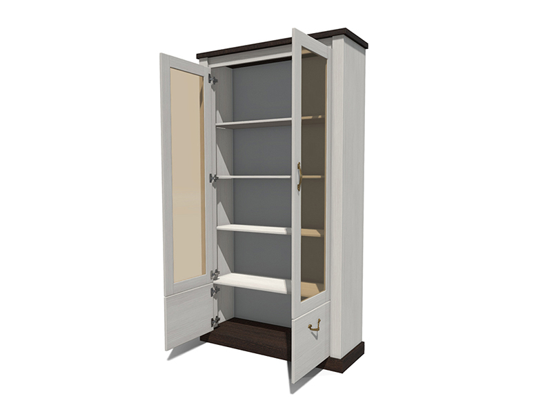 Модель шкафа «Тауэр ТР-ШГ2В» имеет две распашные двери, которые комплектуются тонированным каленым стеклом. Внизу дверного фасада выполнена фрезеровка, которая визуально выглядит как две отдельные дверцы с ручками. Внутри шкафа расположены четыре широкие полки для размещения книг или посуды.