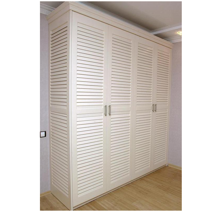 Жалюзийные фасады придают шкафу особый шарм. Плавные линии шкафа, оформленные в современном дизайнерском стиле отлично дополняются стильной фурнитурой, состоящей из вертикальных небольших ручек. Модель исполнена в умиротворяющем белом цвете.