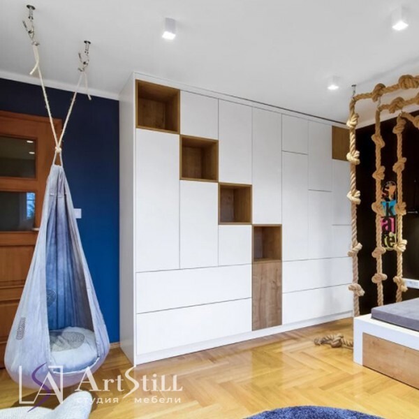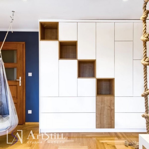 Шкафы выполнен в «Скандинавском стиле». Шкафы и стол спроектированы для работы в детскую комнату для подростка. В шкафу на заказ внутри предусмотрена вешалка для одежды. Полки с древесной структурой образуют геометрическую композицию.