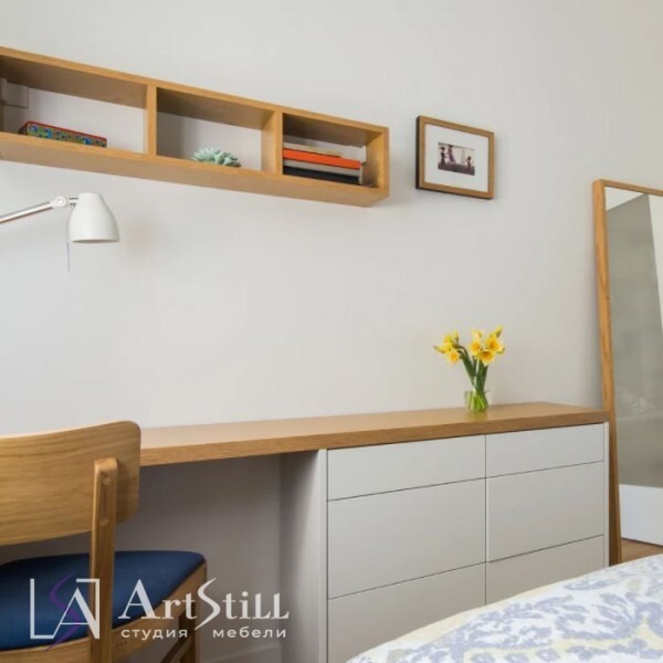 Шкаф выполнен в «Современном стиле». Шкаф и стол спроектированы для работы в детскую комнату для подростка. В шкафу на заказ внутри предусмотрена вешалка для одежды. Нижняя часть шкафа используется для хранения белья.