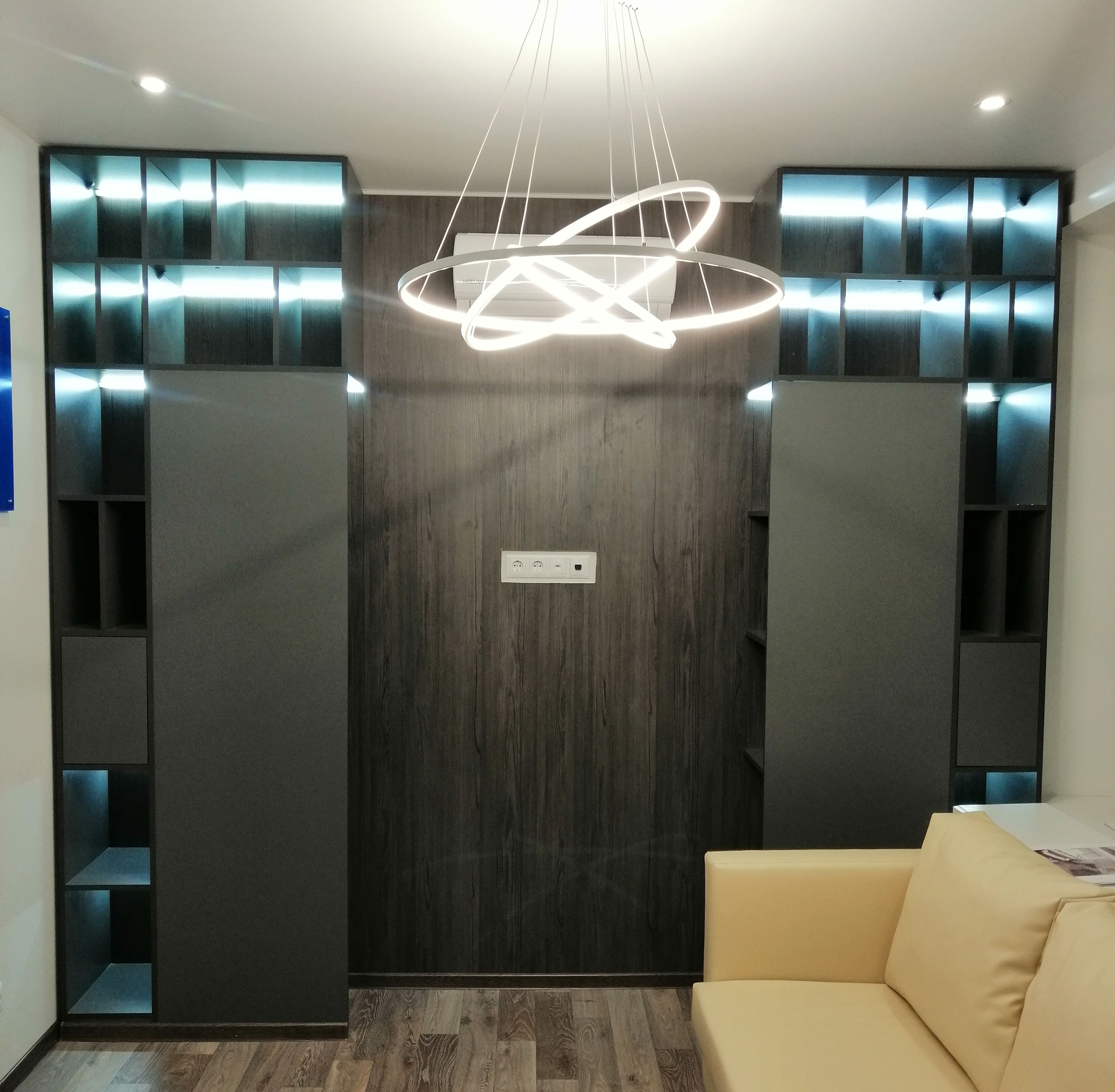 Стильный дизайн, серые матовые фасады, подсветка. Отличное решение для гостиной или кабинета.