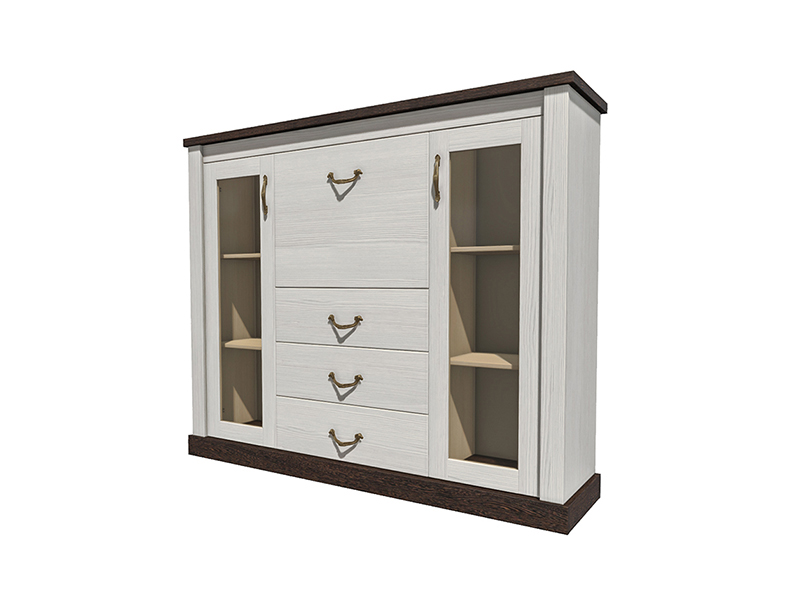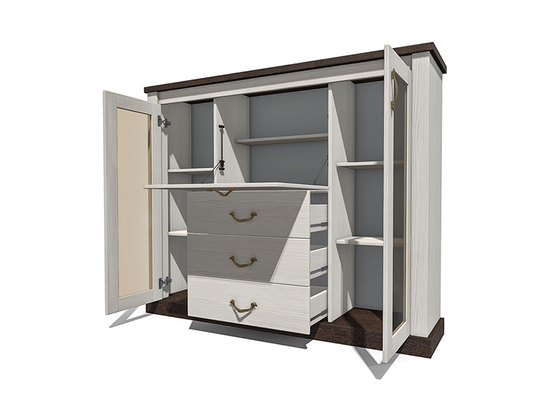 Шкаф с интересной и многофункциональной комплектацией. Конструкция имеет два отделения с распашными дверями, внутри которых находятся по две полочки, одно отделение с дверцей на подъемно-откидном механизме с одной полкой внутри, а также три выдвижных ящика. Ящики оснащены направляющими полного выдвижения, что гарантирует быстрое открытие ящика без заеданий.